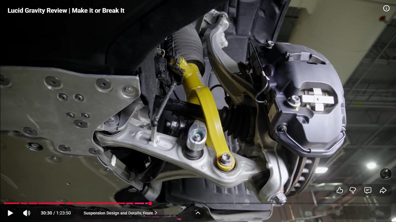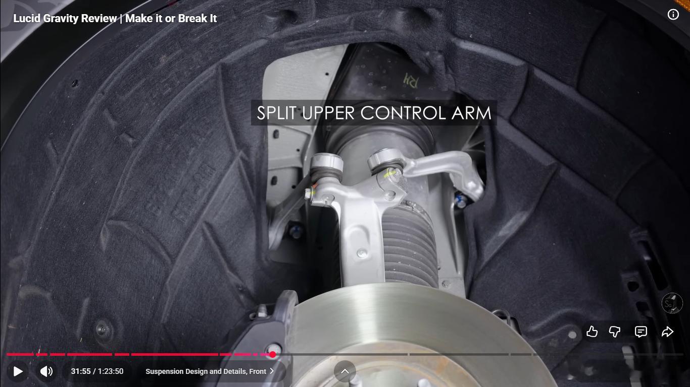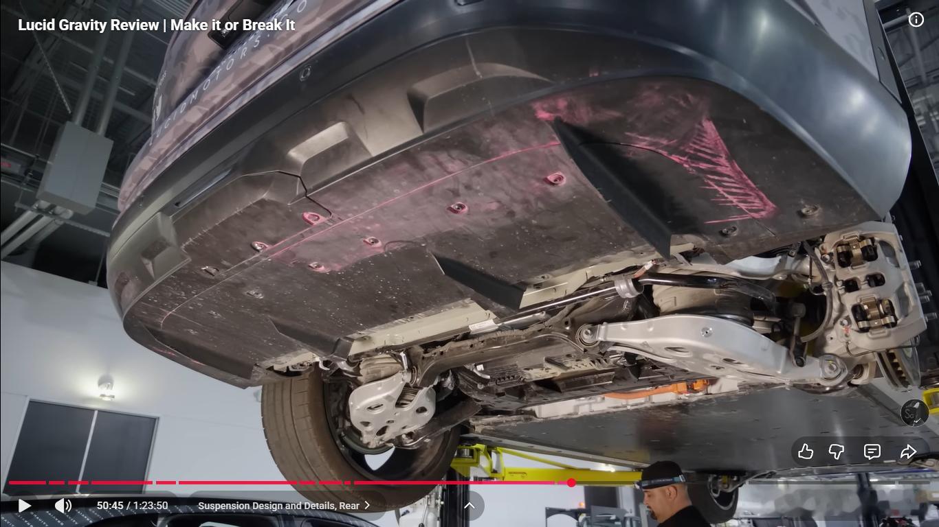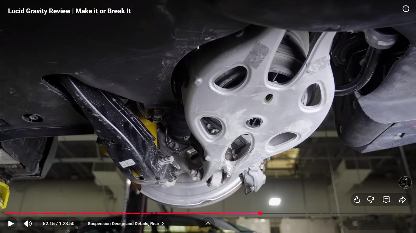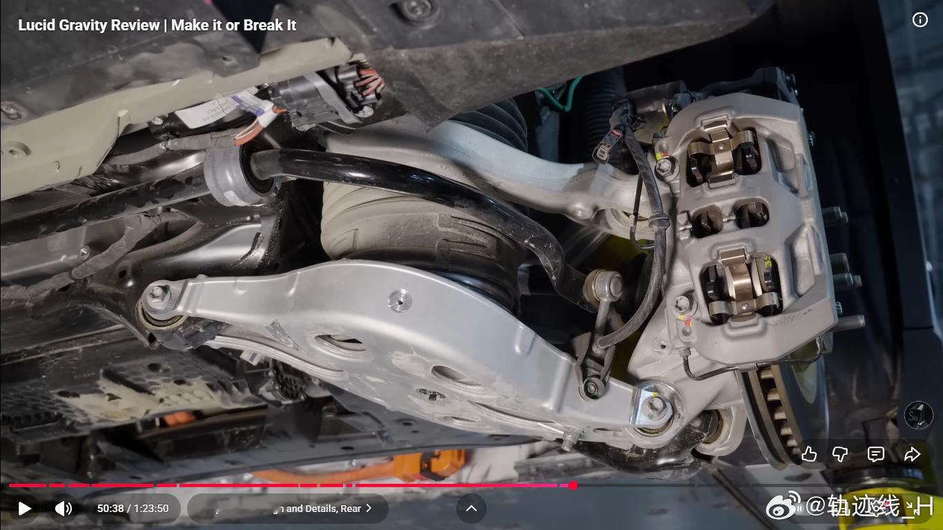 后悬架换成五连杆,有意思的是为了布置大的后电机,弹簧和减振器前后错开,不在一根臂上,弹簧臂设计的也巨大,挺有艺术风格