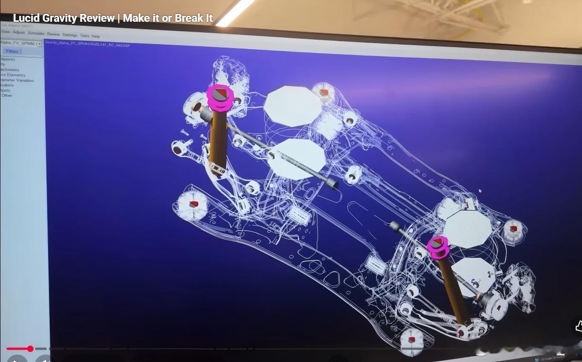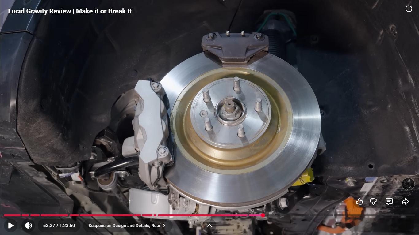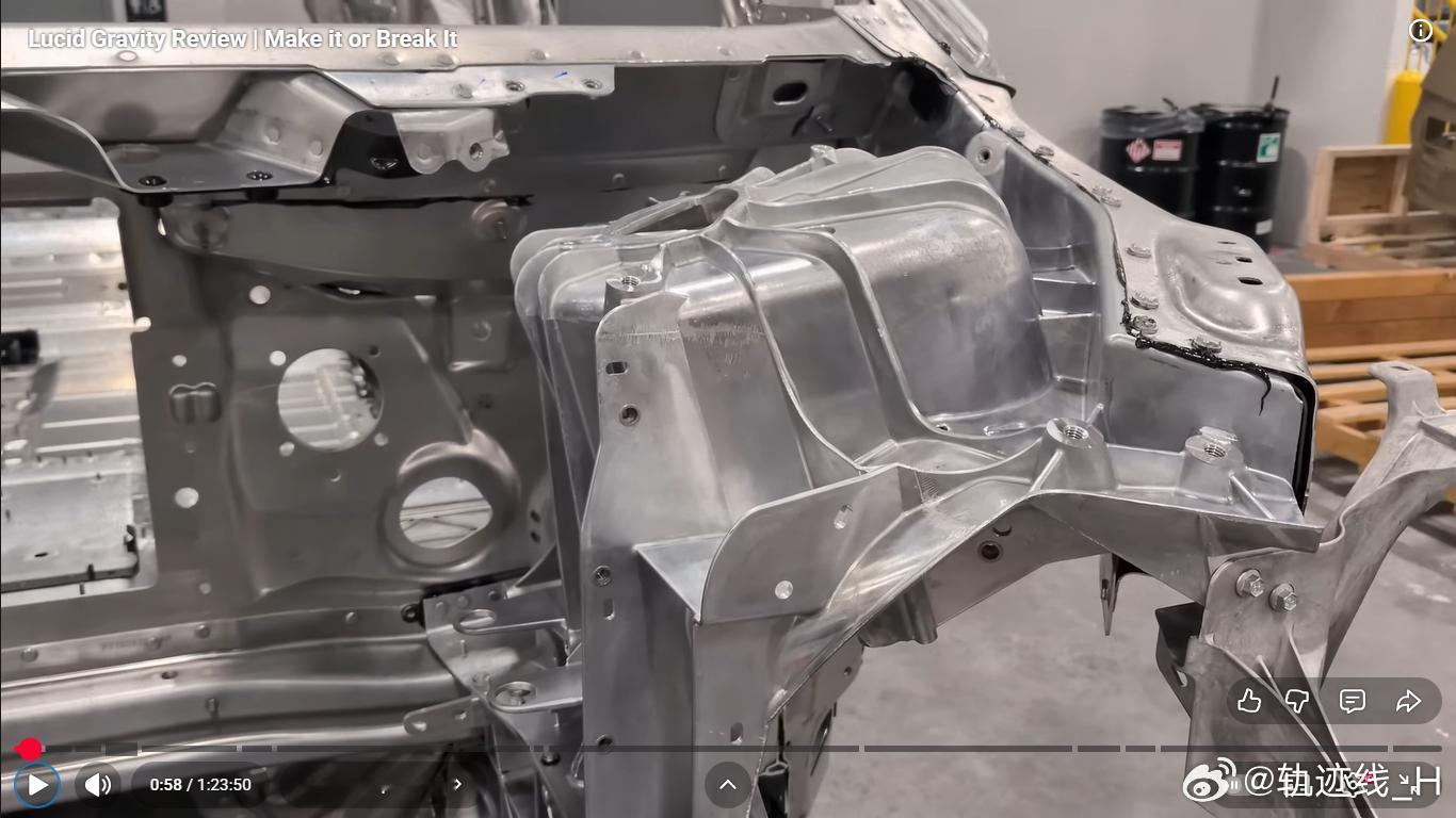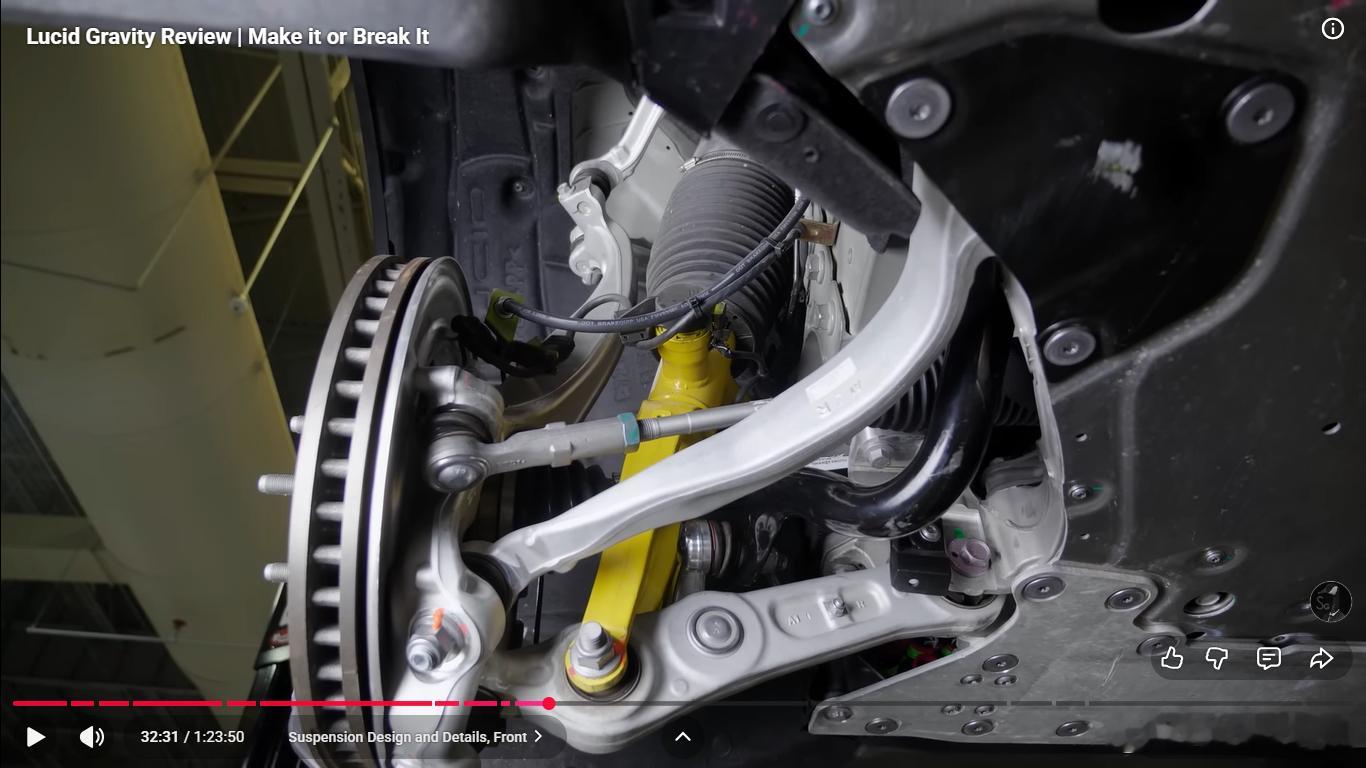 后悬架换成五连杆,有意思的是为了布置大的后电机,弹簧和减振器前后错开,不在一根臂上,弹簧臂设计的也巨大,挺有艺术风格