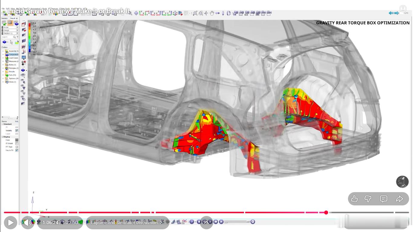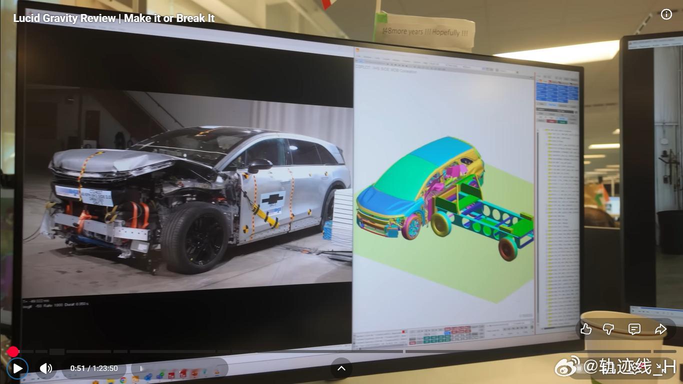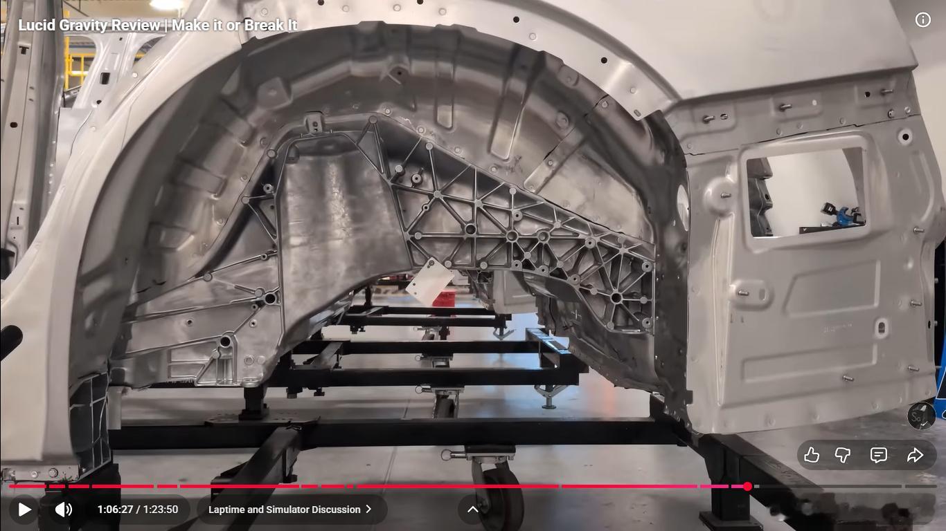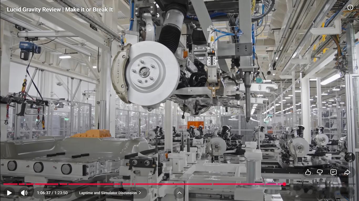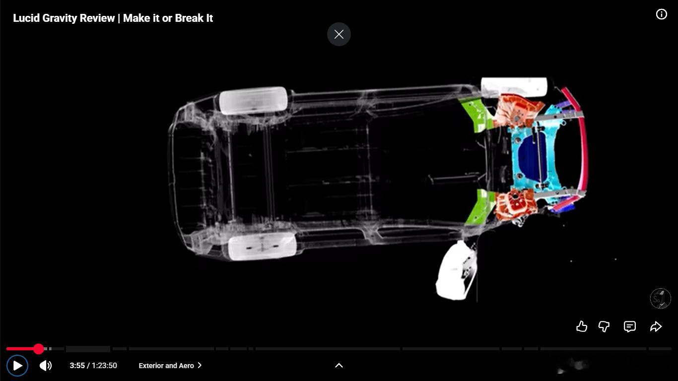后悬架换成五连杆,有意思的是为了布置大的后电机,弹簧和减振器前后错开,不在一根臂上,弹簧臂设计的也巨大,挺有艺术风格