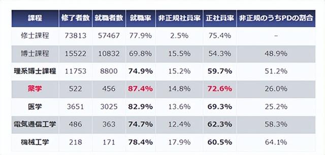 根据日本当地调查,主要是由于日本企业更愿意通过公司内部的培训和教育来培养内部研究人员,而且雇佣博士要支付的年薪更高。所以博士毕业后找到合适的工作并不容易,然而药学和工学博士的就业率在日本博士中是最高的。主要是除了大学学术岗位外,私人研究中心以及民间企业、私营企业提供了很多岗位。
