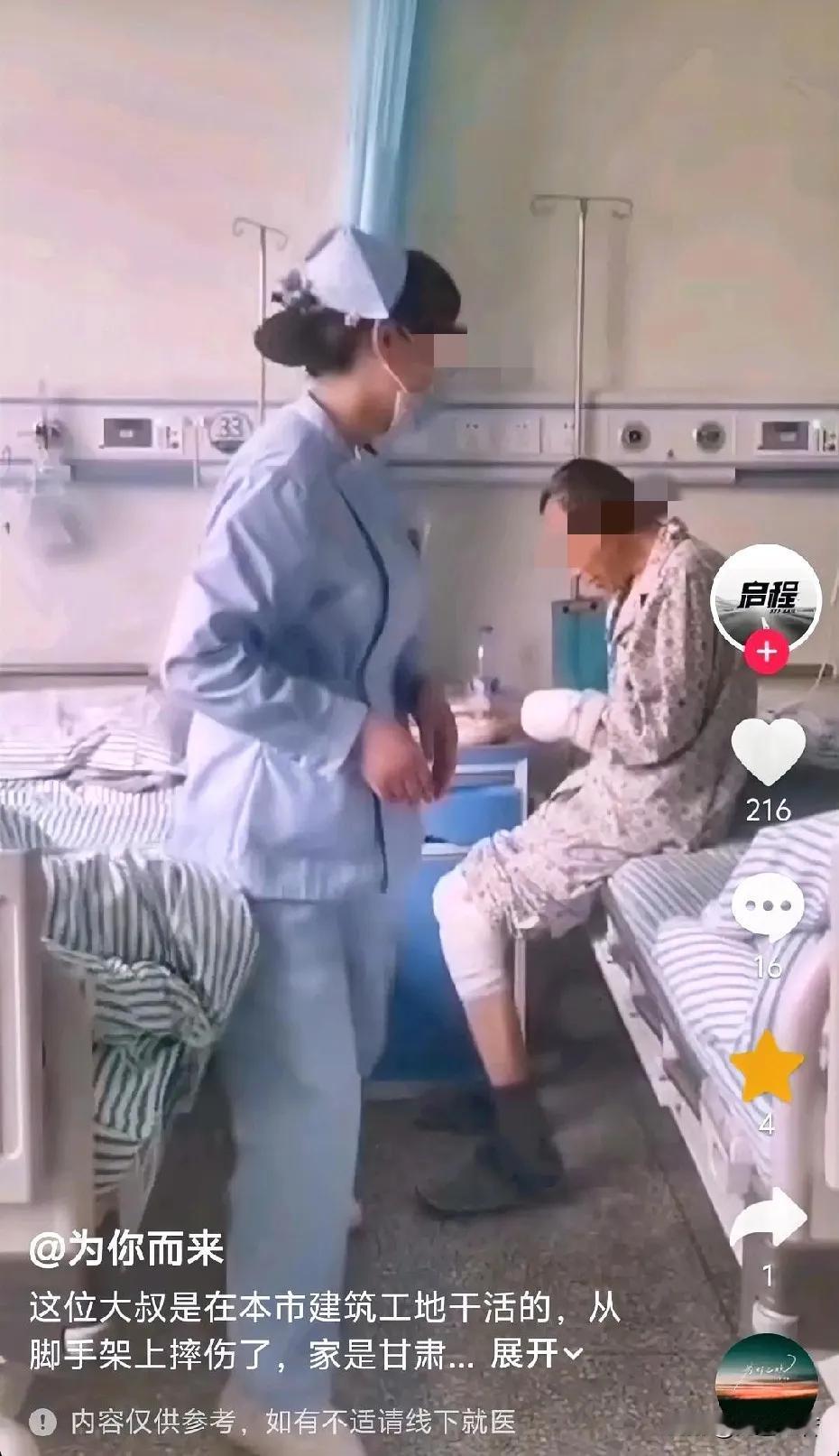“这是亲闺女!”近日,辽宁鞍山,一名小伙子住院期间,发现对面大叔一个人躺在病床上,既没有老伴的陪伴,也没有儿女前来照顾。大叔自己照顾自己,舍不得吃喝,打一份菜要吃好几顿,有时候晚上还不吃饭。 据了解,大叔是甘肃人,跟着老乡来鞍山的建筑工地打工,上个月在脚手架上作业时踩空摔了下来。“家里老婆子身体不好,娃在外地上学,说了也是白让他们操心。”大叔摩挲着床头的安全帽,声音低得像在自言自语,“老乡们忙着干活,也不能总麻烦人家。” 一位护士小姐姐有回来换药,见他正舔饭盒底,忍不住问要不要帮忙订份热粥,大叔赶紧摆手:“不用不用,我不饿,省着点钱够换药就行。” 这哪是不饿啊,分明是怕医药费超支,没保险兜底,每一分钱都得掰着花。护士小姐姐了解后,深受触动,便主动用自己的饭卡为大叔打饭,确保他一日三餐都能吃上热乎的饭菜。 一开始大叔还不好意思,直接拒绝了护士小姐姐的好意,小姐姐呕不过直接说是员工餐,不要钱的,不吃就浪费啦。大叔才连连道谢,不好意思的吃饭。 那份“免费套餐”每天都准时出现,有时是炖菜,有时是热汤,刚好能帮大叔补齐营养。小伙问护士小姐姐为什么要这样好心,她说,见不得这样,自己读书时候父亲也是干工地的,看见他就看见了自己爸爸一样。是啊,多好的姑娘 没有私心,只有一个善良的心,为小姐姐点赞👍 这位护士姐姐的善行,不仅切实帮助了一位身处困境的陌生人,也向社会传递了强大的正能量。总有陌生人用不拆穿的善意,悄悄撑起一片温柔,就像大叔腿上的伤终会愈合,这份藏在烟火气里的温暖,也会陪着他重新站起来。它提醒我们,即使在困境中,人与人之间的关怀与支持也能闪耀出最动人的光芒。