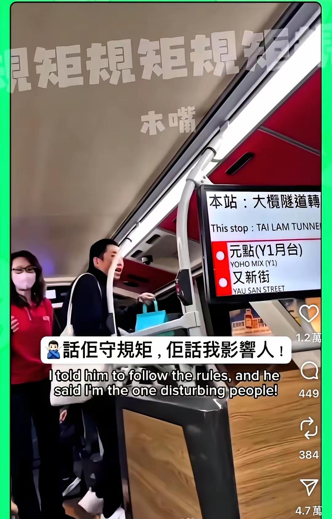 香港九龙某路段巴士上。一位男乘客拧开矿泉水瓶咕咚几口,紧接着被一位短发乘客高声提醒“车厢禁食”,两人一句“吐回杯里”一句“你先把口水收回去”,对喷十分钟 虽然说地铁里面吃东西不好,因为有味道可能影响他人。但是水也不能喝?水无色无味,难道也会影响?这个人性吗?为啥不允许喝水呢? 我搭地铁低血糖了咋办,喝口甜饮料就能缓解让不让呢? 看图证明香港国际化程度高,老外可以为所欲为,国人就得规规矩矩。大家觉得呐?
