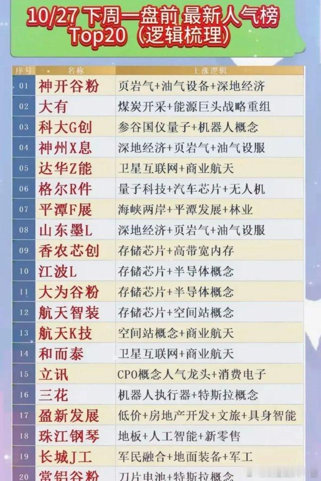 A股[超话]10/27下周一盘前最新人气榜Top20(逻辑梳理)