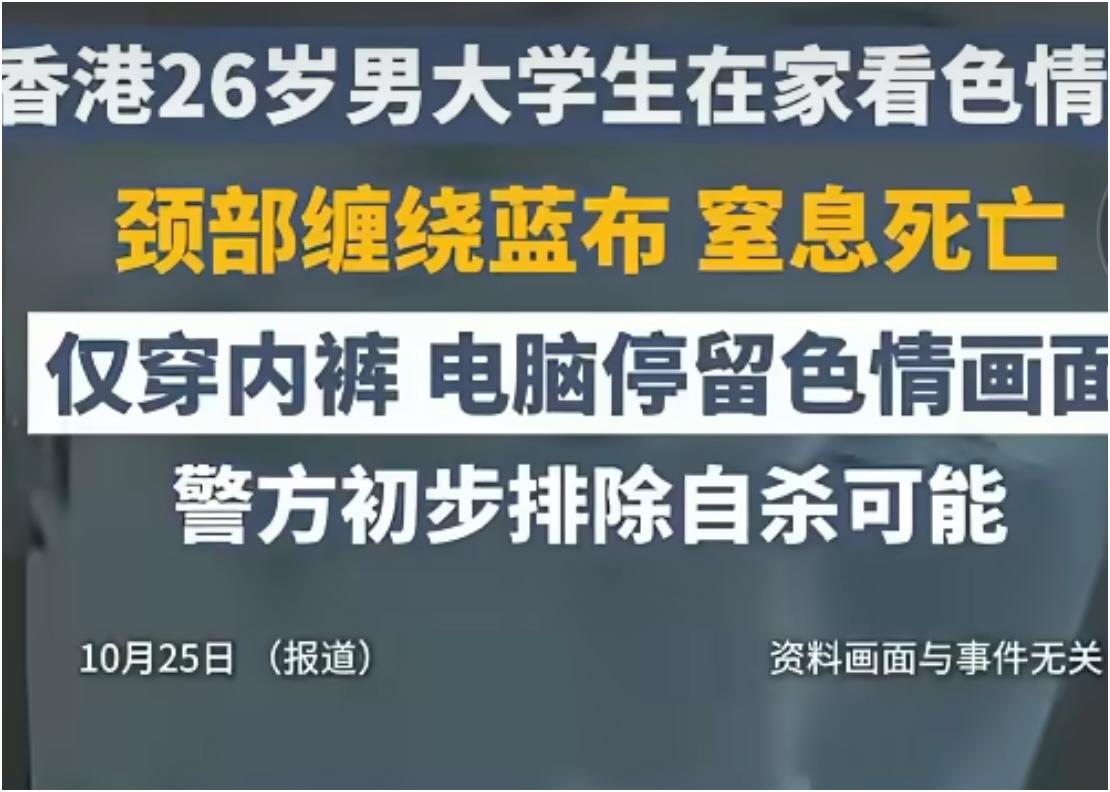 最近香港发生了一件离奇的事儿,一名26岁的男大学生在家看色情片时窒息死亡。10月21日晚他跟妹妹说要准备考试,让别进房打扰,之后几天家人都没见他露面。直到23日晚,黄父开门查看,发现儿子仅穿内裤、颈部缠蓝布昏迷,电脑上还有色情网站画面。 警方排除了自杀可能,推测是他看片时被人从后面偷袭。网友也觉得不太可能是自杀,谁自杀会搞这么尴尬的场景。不过也有可能是意外事故。目前警方还在调查凶手是谁,希望能早日破案,给家属和大众一个真相。