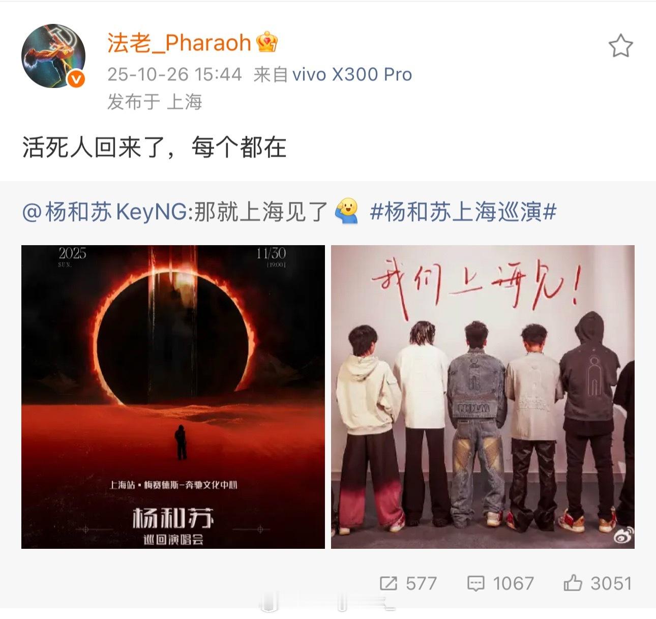 法老转发杨和苏表示:活死人回来了,每个都在!法老