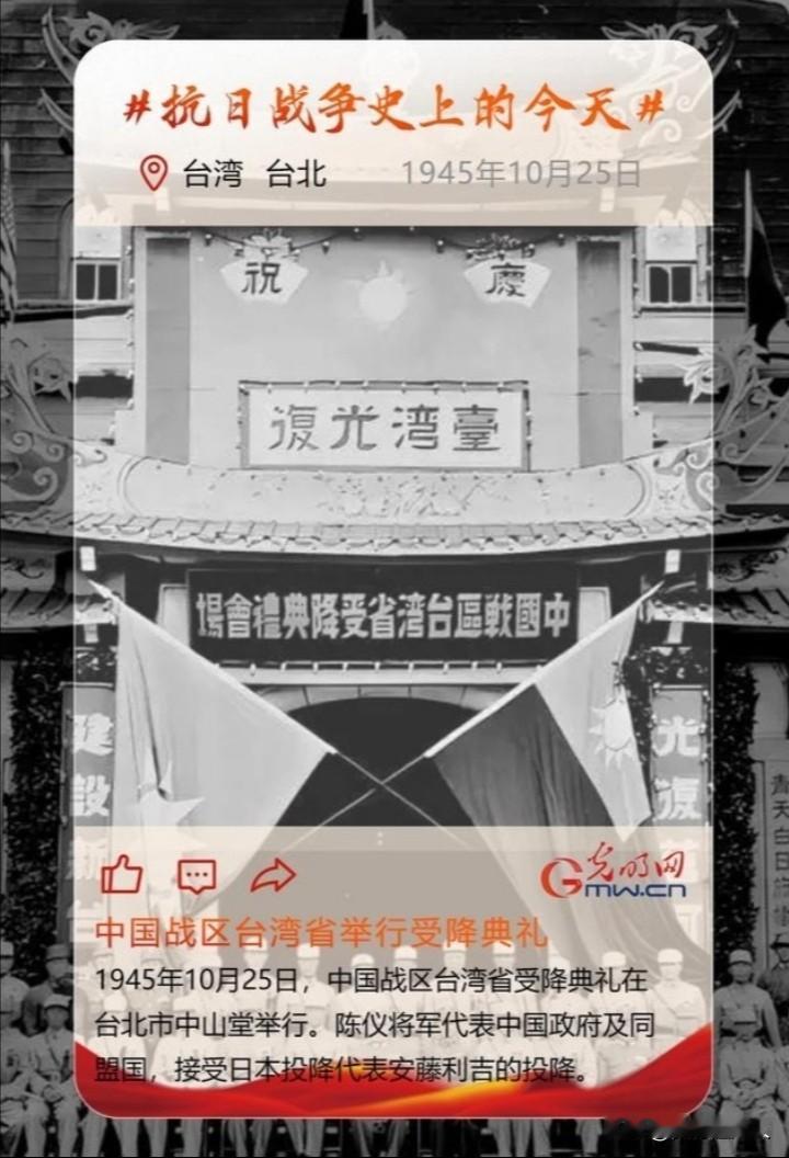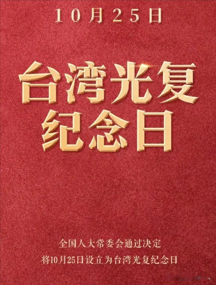 [烟花]台湾光复纪念日[烟花] 2025年10月24日,十四届全国人大常委会第十八次会议经表决,通过了关于设立台湾光复纪念日的决定,以法律形式将10月25日设立为台湾光复纪念日,并规定国家通过多种形式举行纪念活动。 今年是中国人民抗日战争暨世界反法西斯战争胜利80周年,也是台湾光复80周年。 1945年,包括台湾同胞在内的全体中华儿女经过浴血奋战,取得了中国人民抗日战争暨世界反法西斯战争的伟大胜利。 1945年10月25日,中国战区台湾省受降典礼在台北公会堂(今中山堂)隆重举行,日本投降代表、日本驻台末代“总督”兼第10方面军司令官安藤利吉向中方递交无条件投降书,并在投降书上签字。至此,被日本占领长达50年之久的台湾、澎湖列岛重新回到祖国的怀抱,在中国主权管辖之下。 台湾光复是中国人民抗日战争胜利的重要成果,是中国政府恢复对台行使主权的重要铁证,台湾是中国领土不可分割的一部分,两岸同胞有共同的血脉相连,两岸同胞一家亲。 今年是中国人民抗日战争暨世界反法西斯战争胜利80周年纪念日,又是台湾光复80周年纪念日,10月25日绝对是一个值得纪念的日子。 1971年10月25日,联合国大会第26届会议通过投票表决,宣布恢复中华人民共和国在联合国组织中的合法权利,并列入常任理事国,大会第2758号决议指出,”台湾是中国的一个省”,台湾是中国领土不可分割的一部分,中华人民共和国政府是代表中国的唯一合法政府。 “台湾光复纪念日”的设立,促进了两岸关系的发展,共同纪念活动引领两岸同胞传承、加深了台湾青年对世界只有一个中国,台湾是中国领土不可分割的一部分,为完成祖国统一大业做好了准备。