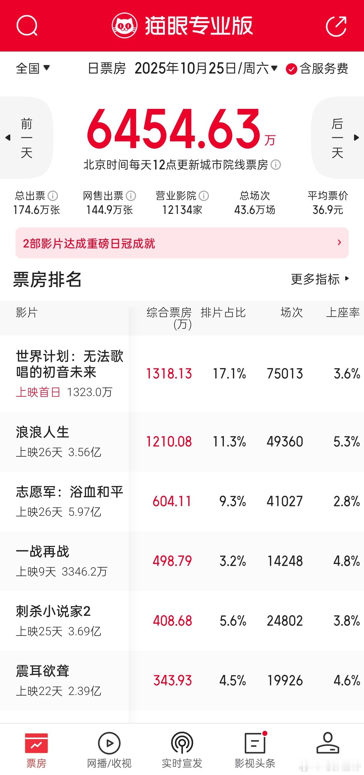 今天票房2500万,《志愿军3》550万累计5.31亿,《浪浪人生》490万累计