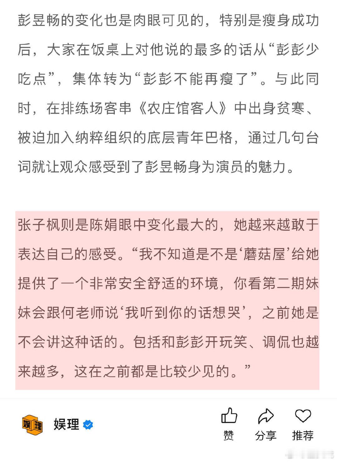 张子枫刚录向往的生活时很焦虑 导演说张艺兴在向往的生活很自律 几季《向往的生活》下来,彭昱畅的变化是肉眼可见的,在排练场客串《农庄馆客人》时,几句台词就能让人感受到他身为演员的魅力。张子枫则是总导演陈娟眼中变化最大的,她越来越敢于表达自己的感受。“之前她是不会讲这种话的。包括和彭彭开玩笑、调侃也越来越多…”娱理独家↓