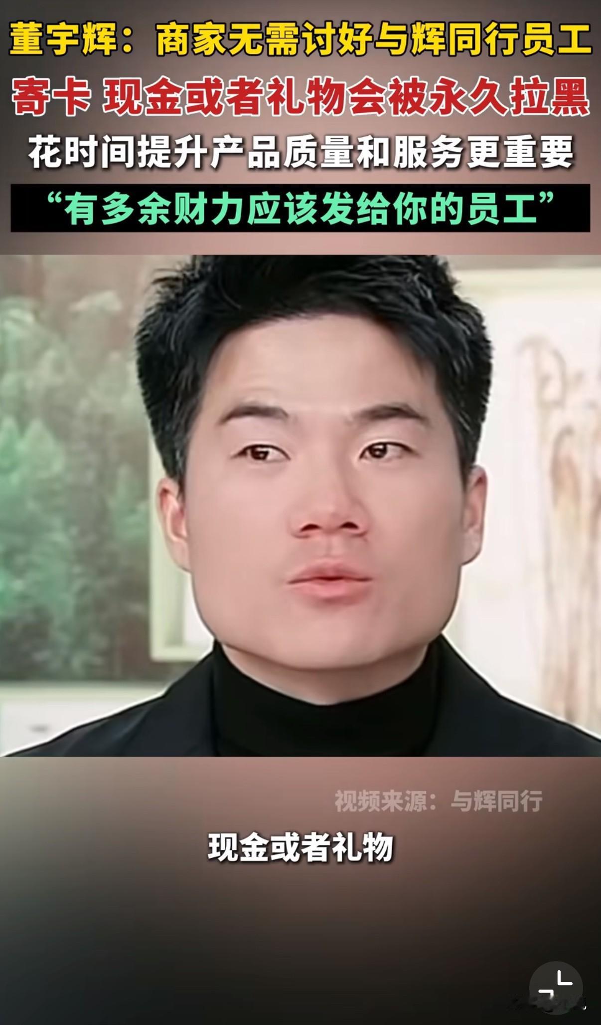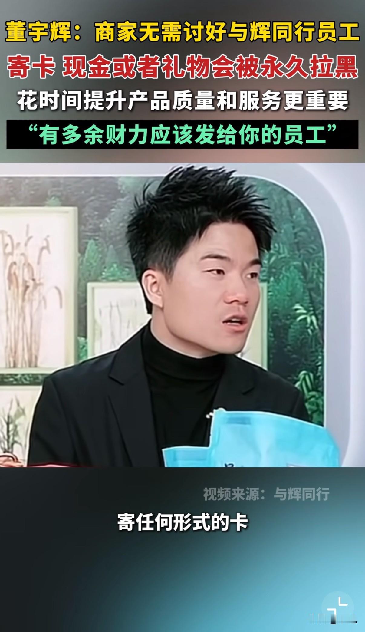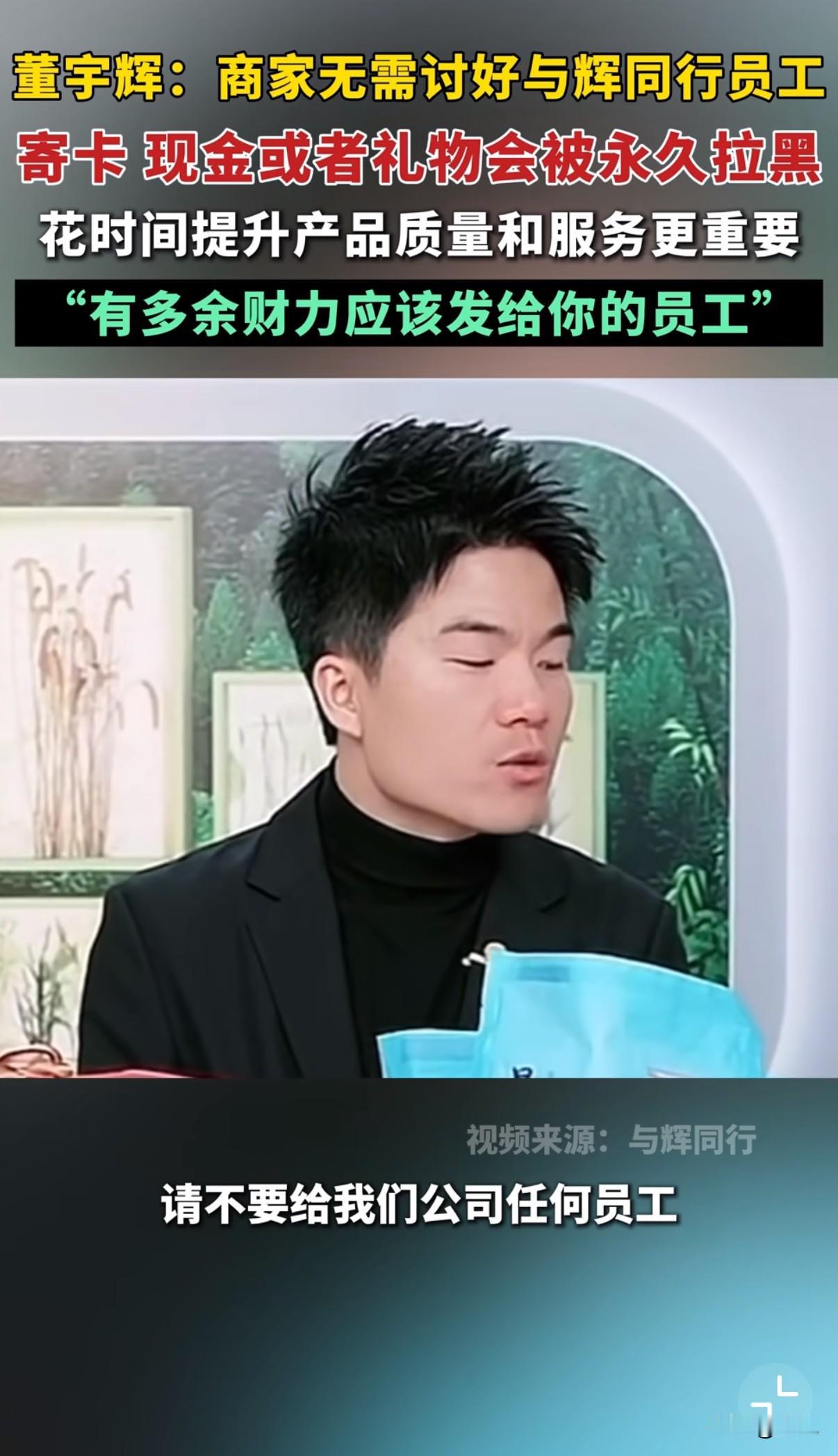 董宇辉直播时又放话了。 他对着镜头直接告诉合作商家:"别给我们公司任何人寄卡、现金、礼物。发现一次,永久拉黑,再不合作。" 去年过年他也说过类似的。当时他就明确表示:"供应商要送礼,以后永远不合作。" 这次他更较真。提到有商家偷偷寄了购物卡,他们半年后才拆开发现。结果直接解除了合作。 他还给商家指了条明路:"有那个钱,不如去改进产品,或者给你们员工涨工资。" 表面看是不讲情面,实际上对双方都好。商家不用额外破费,他们团队也能守住底线。 直播带货这行水很深。今天收张卡,明天可能就不好意思退次货。最后吃亏的是信任他们的消费者。 董宇辉这么坚持,反而赢得更多信任。大家觉得他靠谱,不是光想着赚钱。 也有人怀疑能坚持多久。但他们真处理了违规商家,看来不是做样子。 这种零容忍的态度,对整个行业都是个冲击。要是更多主播都这样,或许真能改变不良风气。 简单直接的商业关系最长久。商家专注产品,主播严选品质,消费者买到好东西。 这事值得整个行业好好想想。