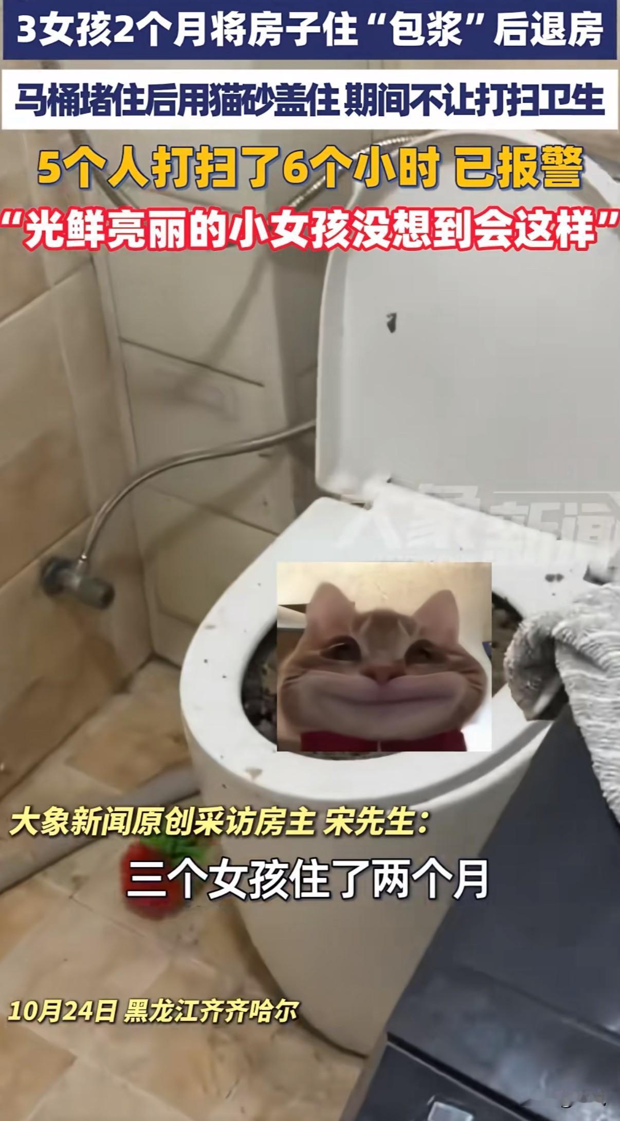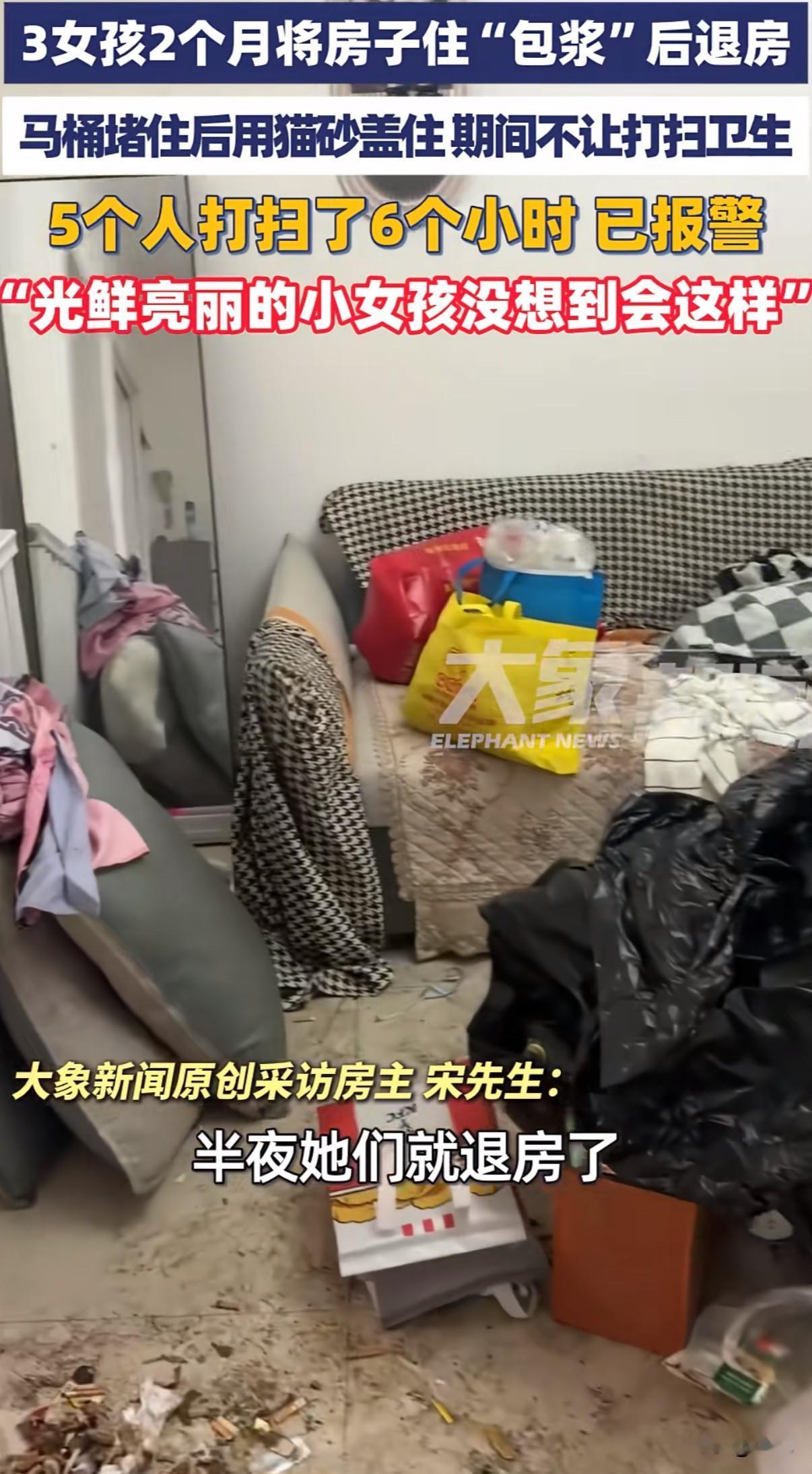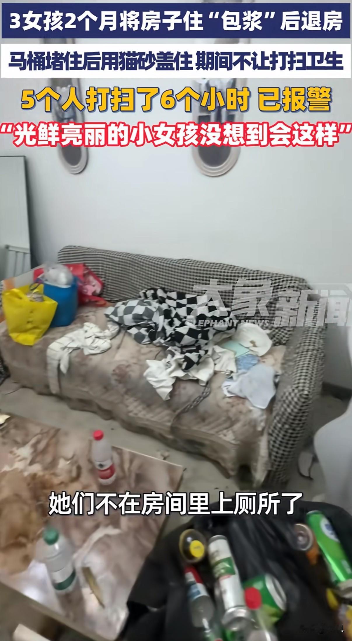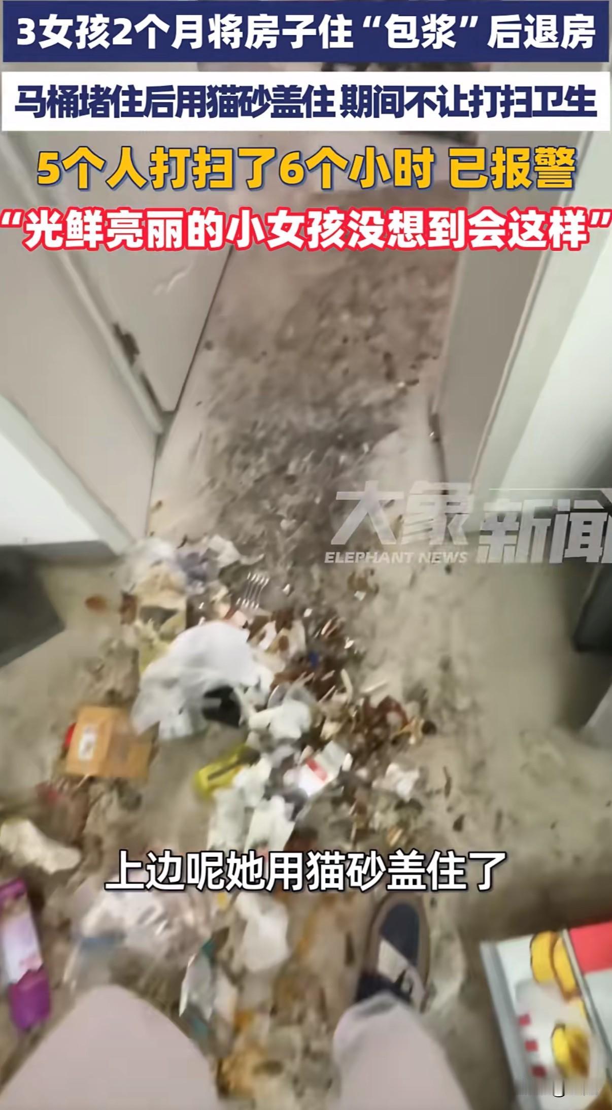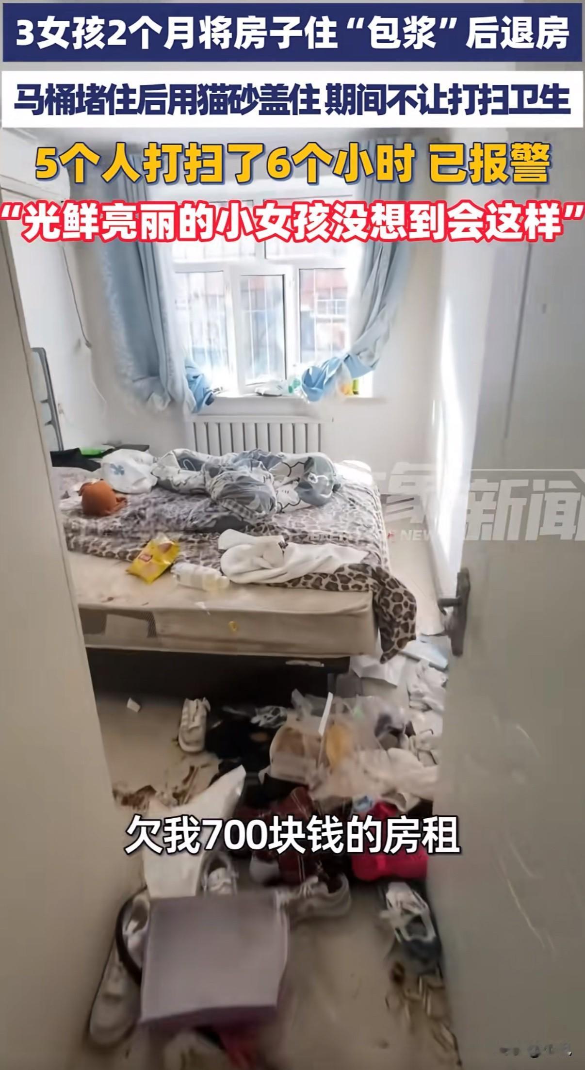 “外表光鲜,屋里成猪圈”!黑龙江齐齐哈尔的宋先生,八月份把房子租给三个年轻女孩。才两个月时间,收房时直接傻眼。 满屋垃圾堆成山,根本没法下脚。马桶堵得严严实实,里面全是乱七八糟的东西。家具窗帘全都毁了,屋里臭气熏天。 保洁阿姨打开门那一刻,眼泪都在眼眶里打转。五个大人,整整清理了六个小时,才把屋子收拾出来。 最让人无语的是,这三个女孩还欠着七百块钱房费。连夜搬走联系不上,报警后才回话说一时拿不出这么多钱。 平时出门打扮得光鲜亮丽,谁能想到背地里把住处糟蹋成这样。这种反差实在让人难以接受。 租房这事真的考验人品。有些人表面干干净净,实际生活习惯一塌糊涂。把别人房子住成垃圾场,还欠费跑路,这已经不只是卫生问题。 房东出租房子也不容易,遇到这样的租客真是头疼。现在租房市场纠纷不断,大家租房子都要多留个心眼。 房子是租的,但生活不是。同样,房子是租的,但别人的财产也不是用来随意破坏的。基本的尊重和爱护都应该有。 这事在网上引发热议不是没有道理。谁都不希望自己的房子遇到这样的租客,谁也不想遇到这样糟心的租房经历。