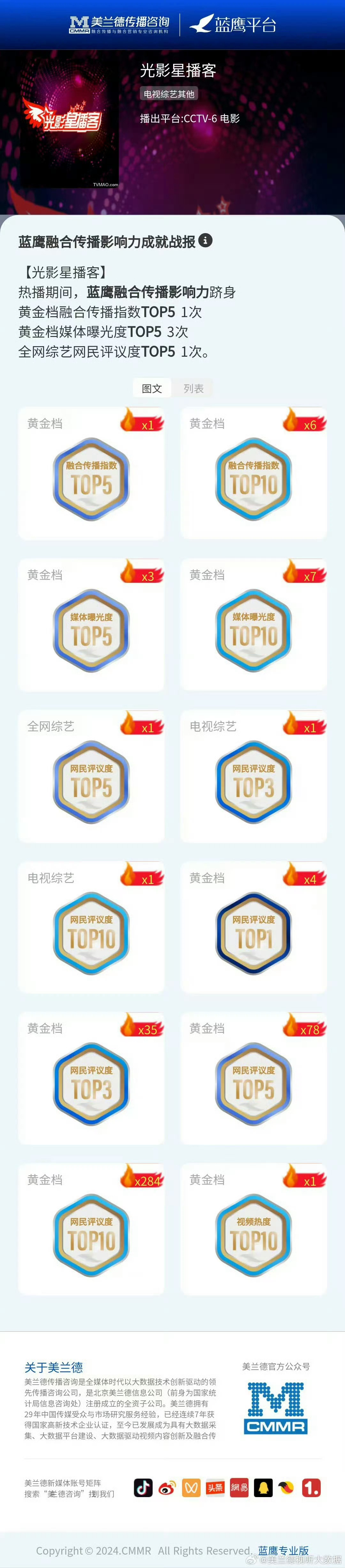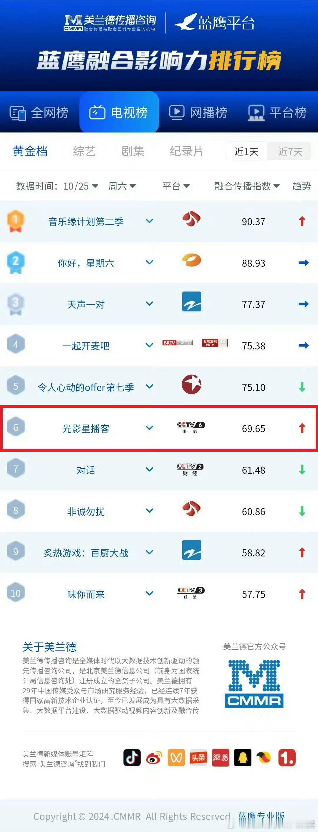 tg:昨晚央六田栩宁做客光影星播客栏目网民评议度92.73,美誉度99.59,晚间黄金档电视节目融合传播指数榜第6
