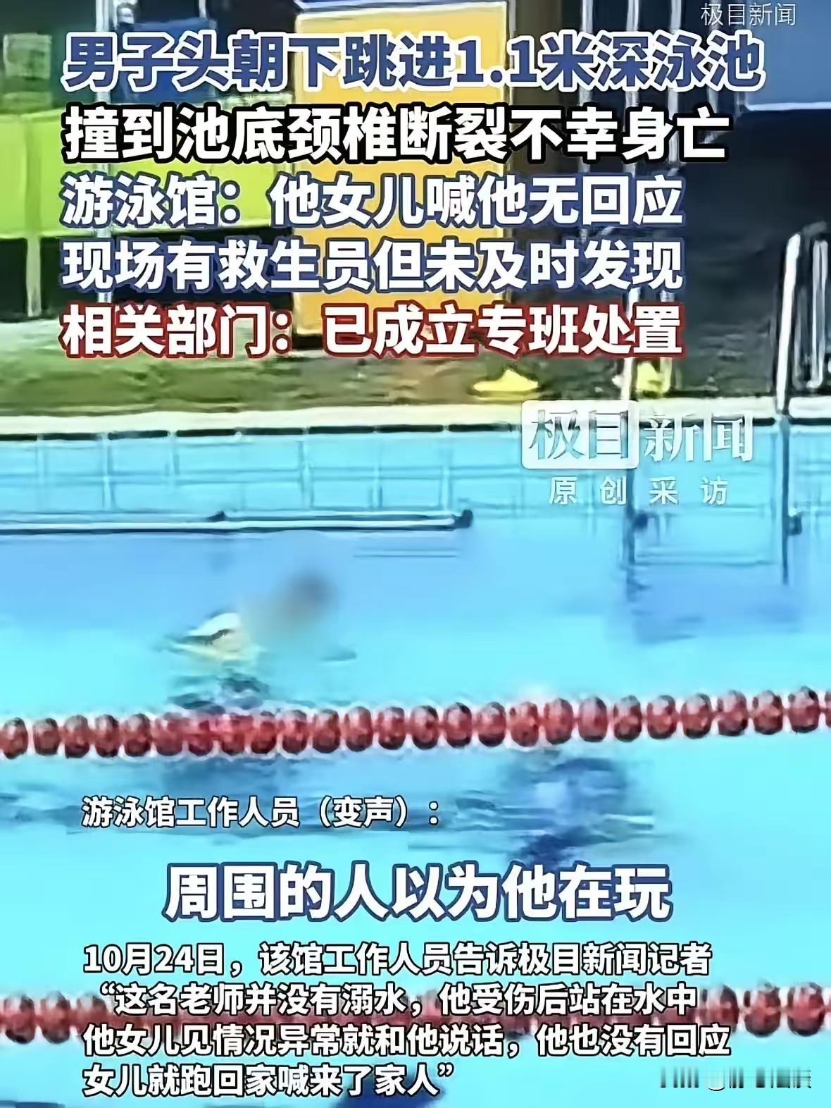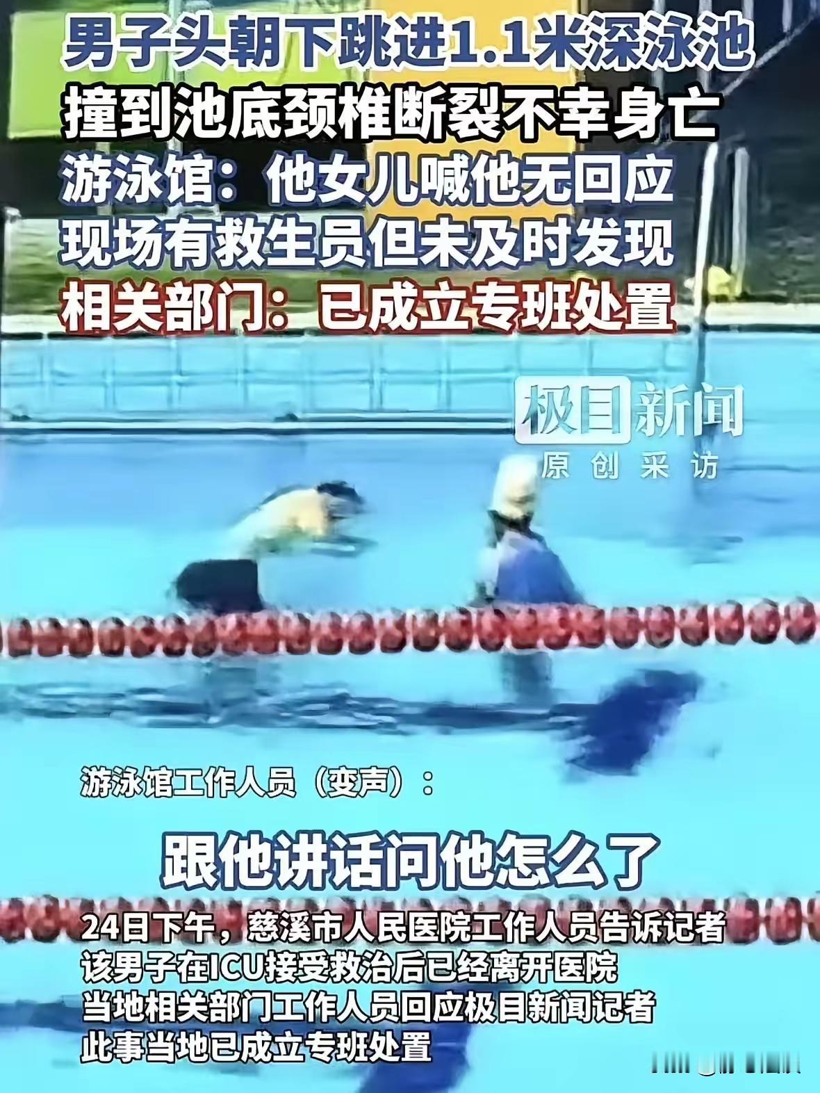 浙江宁波,一名男子带着7岁的女儿去游泳。在1.1米的浅水区,男子以头和双臂向下的