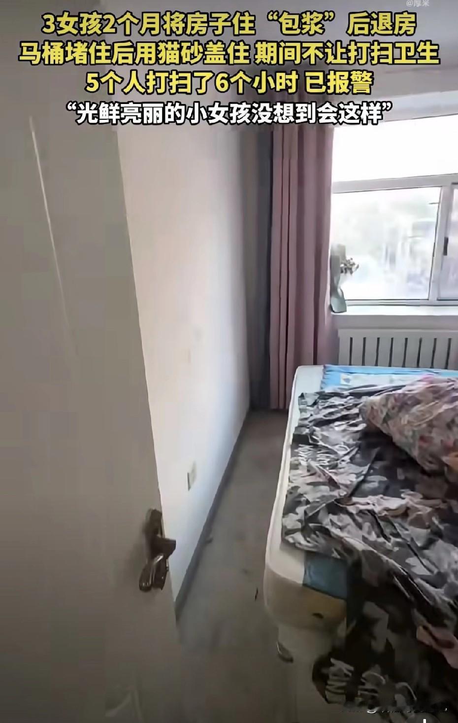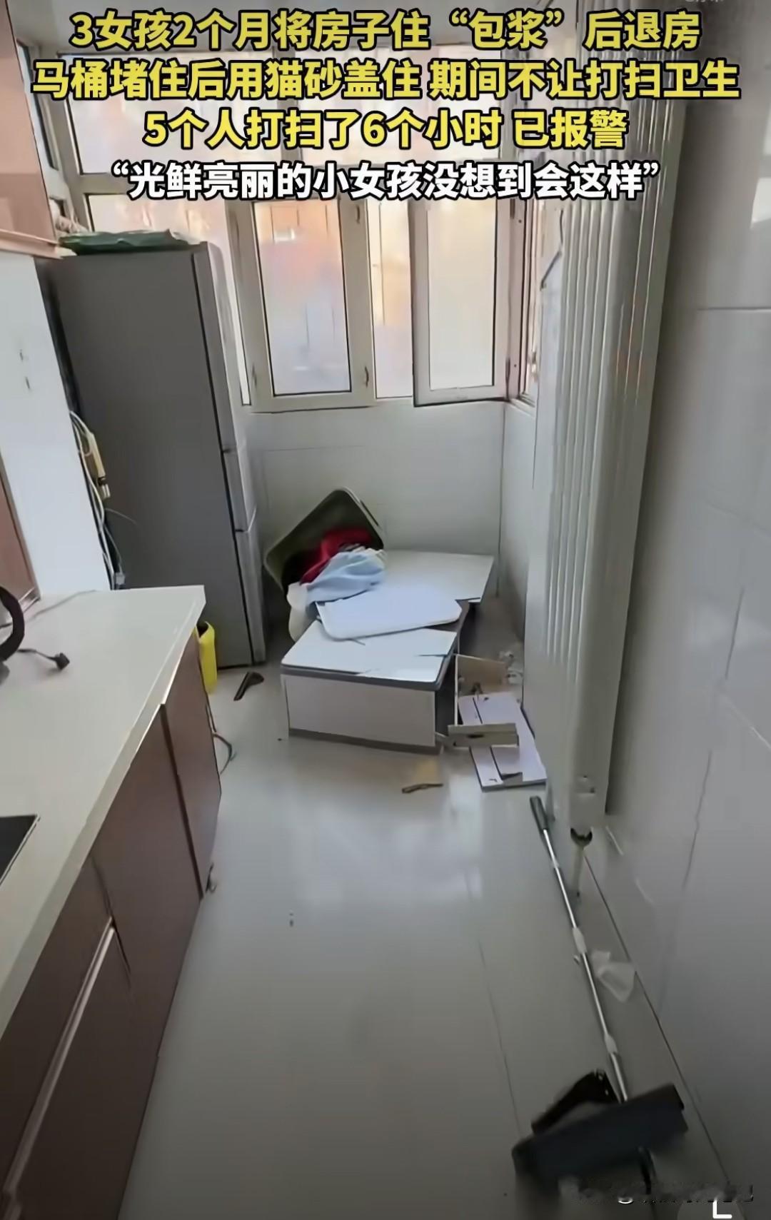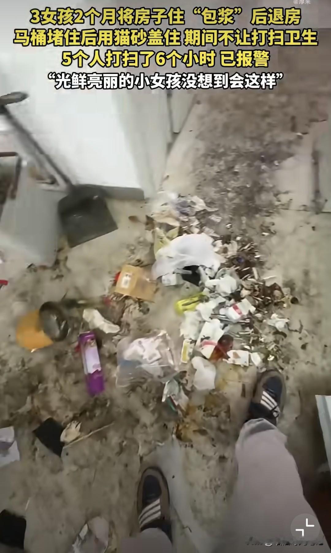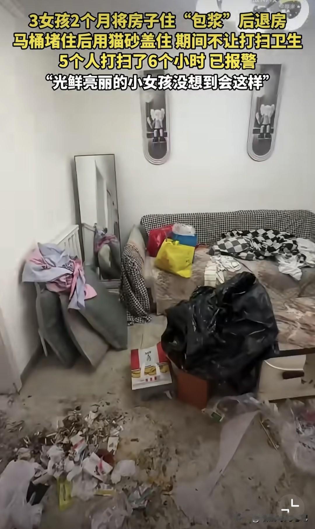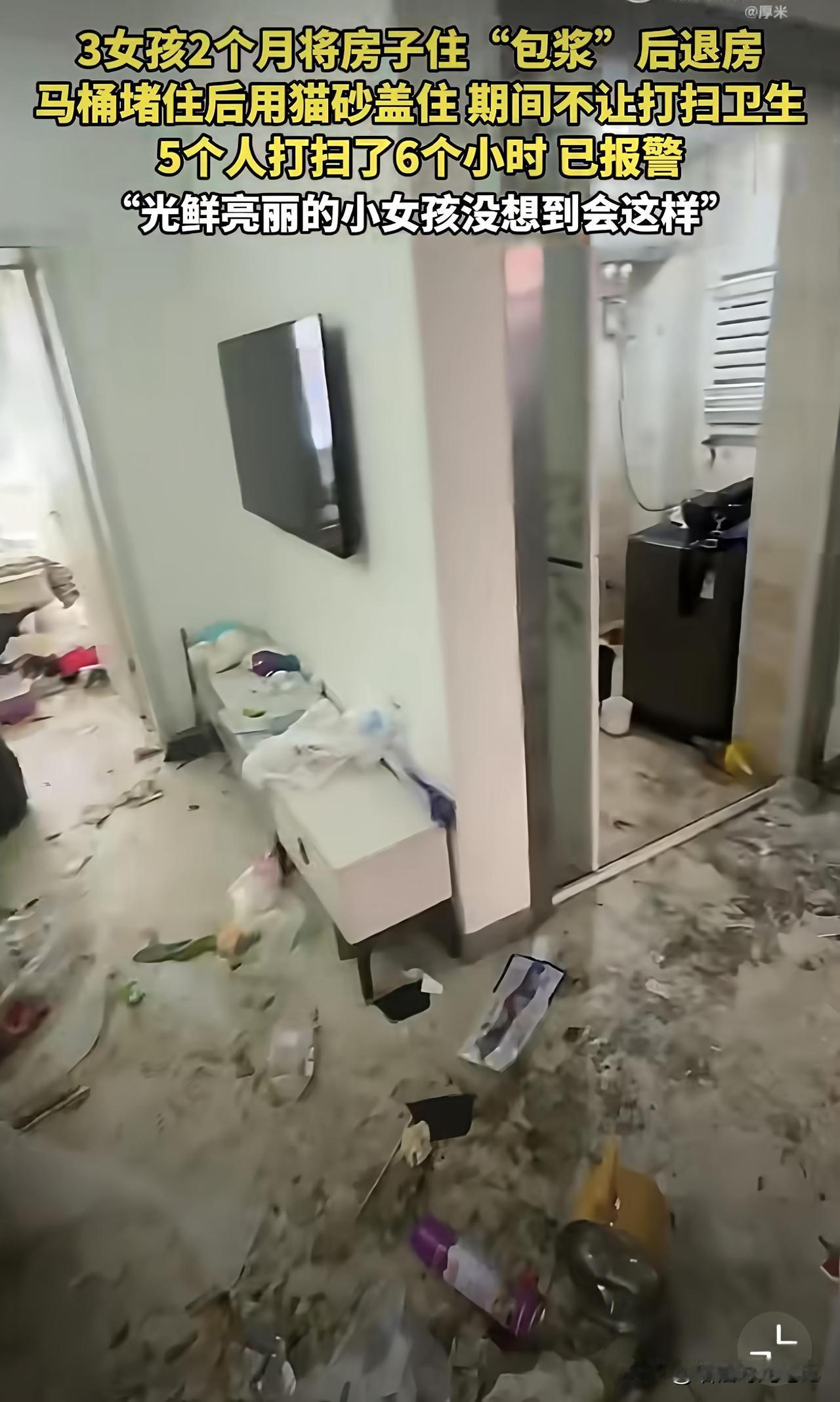 “光鲜小仙女”反手把房住成粪坑。黑龙江齐齐哈尔的宋先生,8月把房子租给三位“看着挺利索”的小姑娘。结果俩月后,人家半夜提桶跑路,留下一屋子“惊喜”。 才租60天,屋里就进化成“生化仓库”。垃圾堆成山,白墙住成“黑森林”,地板黏到能粘鞋,马桶更绝——粑粑满槽,猫砂盖味,冲水键直接成摆设。洁大姐边掏边哭:“我刷过厕所,没挖过粪坑!”5个人干了6小时,口罩加两层都挡不住那股酸爽。更离谱,700块房租还欠着,姑娘微信回一句“没钱”,直接玩消失。以后谁敢租给她们? 网友炸锅: “外表小仙女,屋里盘丝洞,这反差谁顶得住?” 有人怪房东太佛没定期房屋检查,有人骂女孩拆家+投毒,可核心就俩字:规则。 合同不是草纸,押金不是红包,信用不是朋友圈人设。 你今天把房子住成“考古现场”,明天简历上的“诚信”就写不进一个HR心里。 别总觉得“房子不是自己的就随便造”,生活可都连着大数据,指不定哪天“包浆”黑历史就出现在下一份租房报告里。 说到底,租房不是过家家,是契约、是公德、是成年人最基本的“开卷考”。 朋友们,你遇过奇葩的租客吗?