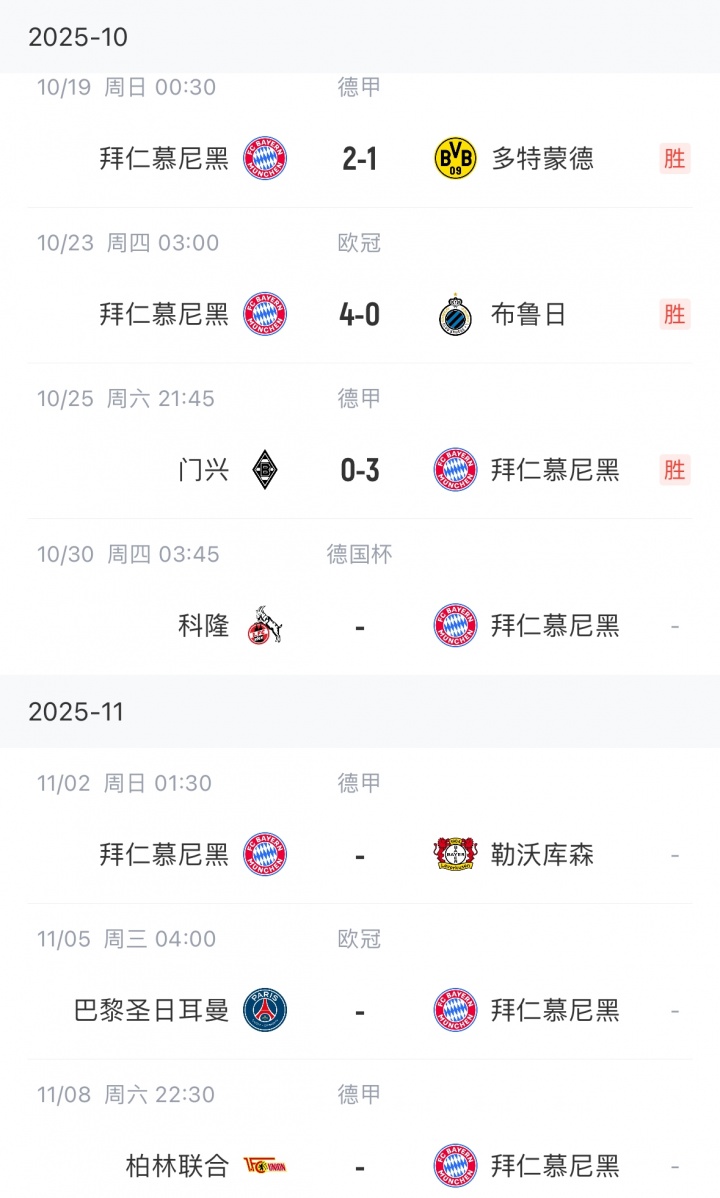 直播吧10月26日讯在周末战胜门兴后,本赛季开局拜仁取得各项赛事13连胜。