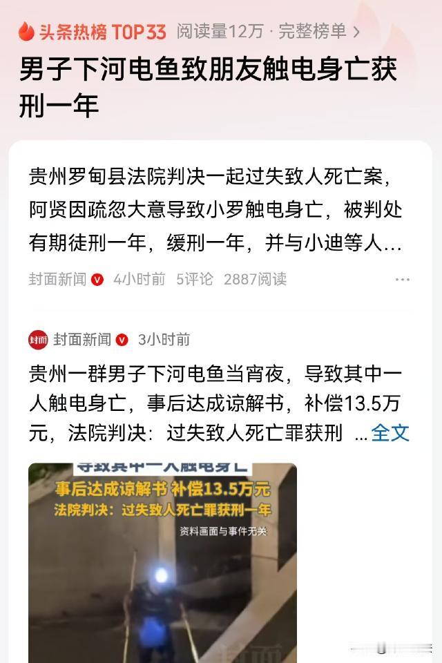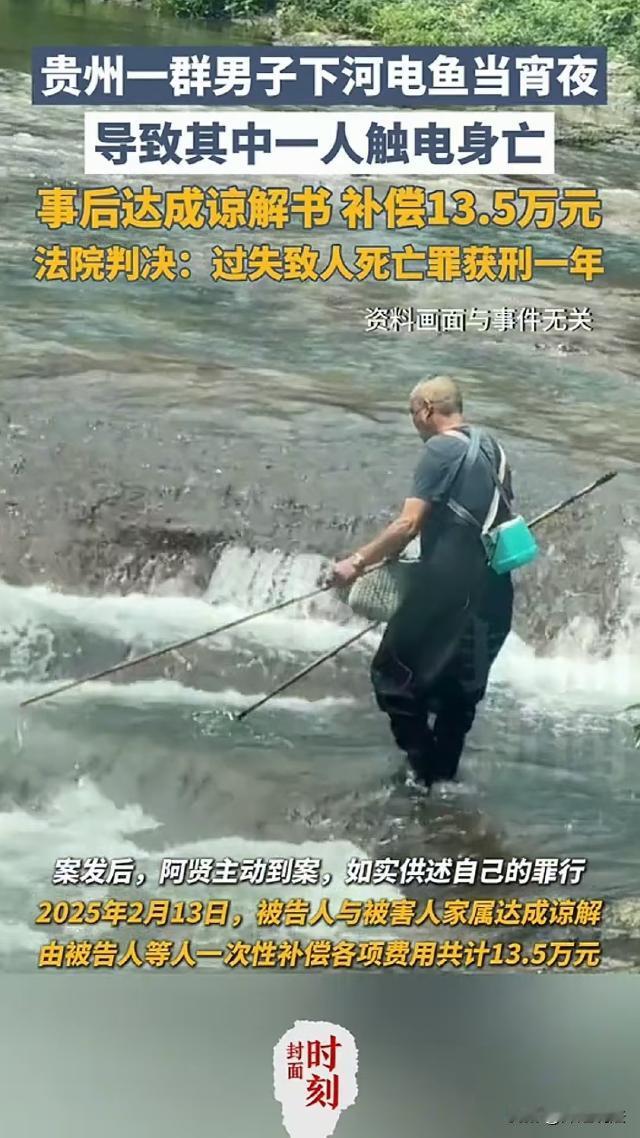 贵州罗甸县,男子和三个朋友吃完晚饭,决定去小河里电点鱼当宵夜,结果男子疏忽大意之下,将带电的网兜递给了一个朋友,朋友当场触电。男子和其他人赶紧将其送去救治,可触电者仍旧不治身亡,男子因此获刑。 去年2月15日晚上,阿贤和朋友小罗、小迪等朋友一起吃饭。 晚上7点多钟,几人吃完饭后,小罗提出,河里的野生鱼鲜美,反正闲着没事,不如去河里电点鱼当宵夜。 几人一听顿时来了兴趣,于是一块去找电鱼机。 众人一连问了多家,最后在一个村民家里借到了电鱼机,阿贤、小罗等人一起来到村里的小河边电鱼。 阿贤穿上皮裤后,下到河里开始电鱼,没多大会,就电了半网兜。 岸上的人惊叫连连,让阿贤把电到的鱼倒出来,再多弄点。 于是,阿贤就将网兜递到岸上小罗旁边,可是因为一时大意,阿贤忘了关电机。 小罗去接网兜的时候,不慎碰到了网兜里的铁圈触电,扑通一声跌入河里。 阿贤顿时反应过来,立即关了电机,并和小迪等人将小罗救了上来。 见小罗双眼紧闭,面如黄纸,众人赶紧将他送到医院抢救。 尽管全力抢救,16日凌晨,小罗还是救治无效死 亡了。经鉴定,小罗是因电击而亡。 案发后,阿贤主动投案自首,后因过失致人死 亡罪被提起公诉。 2025年2月13日,阿贤、小迪等一众人和小罗的家属签订了谅解协议,众人共同赔偿小罗家属13.5万元。 那么,本案涉及到了哪些法律问题?阿贤会受到什么处罚? 1、阿贤、小罗等人电鱼是违法的。 《渔业法》第三十八条规定,使用炸鱼、毒鱼、电鱼等破坏渔业资源方法进行捕捞的,违反关于禁渔区、禁渔期的规定进行捕捞的,或者使用禁用的渔具、捕捞方法和小于最小网目尺寸的网具进行捕捞或者渔获物中幼鱼超过规定比例的,没收渔获物和违法所得,处五万元以下的罚款;情节严重的,没收渔具,吊销捕捞许可证;情节特别严重的,可以没收渔船;构成犯罪的,依法追究刑事责任 。 本案中,阿贤等人未经许可,私自使用电鱼机在河里电鱼,这种电鱼行为不仅严重破坏了渔业资源和水生生态环境,也对公共安全造成了潜在威胁,属于非法捕捞行为。 2、小罗死亡责任应该如何划分? 从事件的直接起因来看,阿贤在将带电网兜递给小罗时,因疏忽大意忘记关闭电机,这一疏忽行为直接导致了小罗触电。 阿贤作为电鱼行为的实施者和设备的操作者,对电鱼机的危险性有直接的掌控义务,他的疏忽是小罗触电的直接原因,因此阿贤在小罗死 在事件中负有主要责任。 然而,电鱼本身是一种具有危险性的行为,小罗作为一个成年人,应当对电鱼行为的风险有一定的认知。 在接网兜时,小罗没有充分注意到网兜带电的可能性,自身也存在一定的疏忽。但相较于阿贤直接的疏忽操作,小罗的过错相对较小。 综合来看,小罗死 亡的主要责任在于阿贤,但小罗自身也需承担一定的次要责任。 最后,小迪等人作为同行者,非但没有劝说、阻止小罗和阿贤的电鱼行为,反而积极响应,众人也应该承担一定的责任。 3、阿贤构成过失致人死 亡罪,应接受相应的刑事处罚。 根据《刑法》第二百三十三条规定,过失致人死 亡的,处三年以上七年以下有期徒刑;情节较轻的,处三年以下有期徒刑。本法另有规定的,依照规定。 阿贤应当知道其将带电网兜递给他人可能会造成他人触电死 亡的后果,但因疏忽大意忘记关电机,以致造成小罗死 亡的严重后果,符合过失致人死 亡罪的构成要件。 但是,阿贤在小罗触电后及时采取了施救措施,主动投案自首,并且在案发后主动与被害人家属达成书面赔偿协议并履行完毕,得到了被害人家属的书面谅解,这些情节表明阿贤有悔罪表现。 在量刑时,这些情节会相应减轻对阿贤的处罚。 最终,一审认为阿贤构成过失致人死亡罪,但因其存在多种可从轻处罚的情节,依法判处其有期徒刑1年,缓刑1年。 来源:,封面新闻等