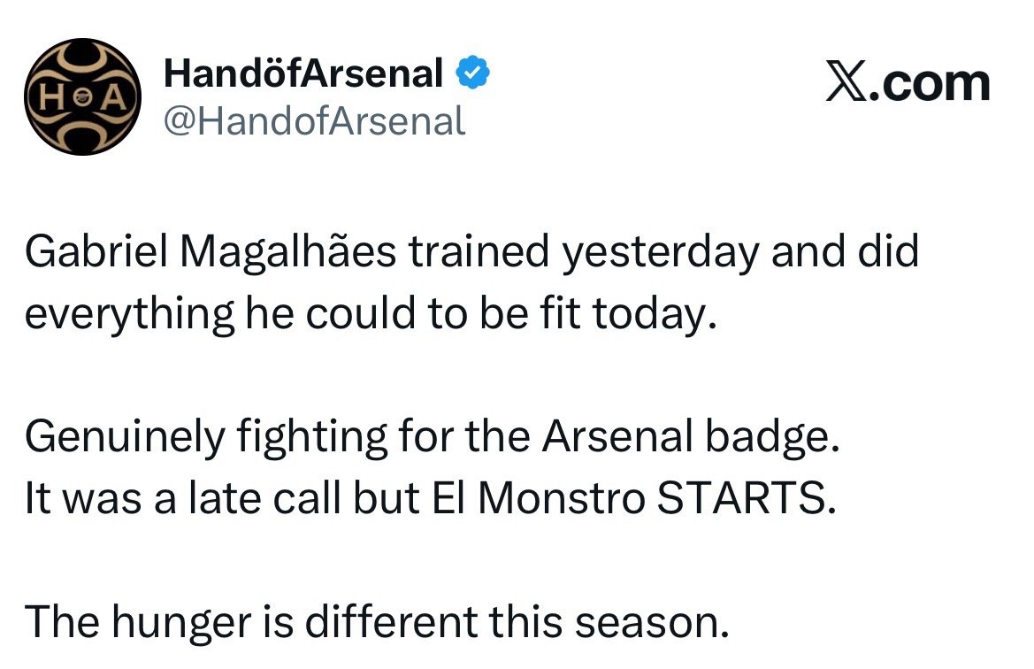 HandofArsenal:加布里埃尔昨日参加了训练,并为能在今日复出付出了全力。他是在为阿森纳的队徽而战。虽然直到最后一刻才确定,但"怪物"加布里埃尔首发登场。本赛季,全队的求胜欲望已截然不同。每个人都在全力以赴。