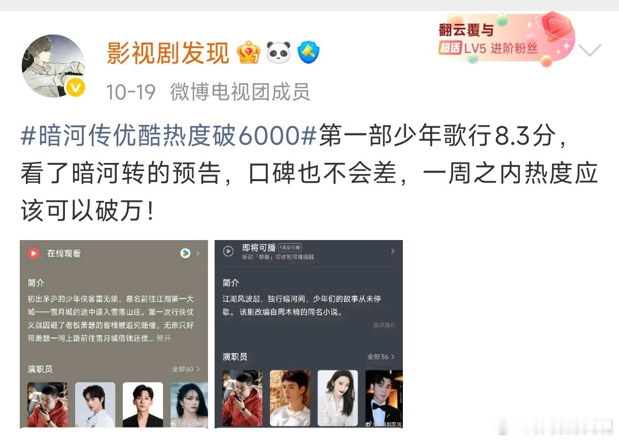 龚俊暗河传破万我就说有第一部的口碑加持,暗河传热度肯定可以破万,从19号到今天正正好好一周,从20号开播日算不到一周,不管怎样暗河传真的很好看,强烈推荐!