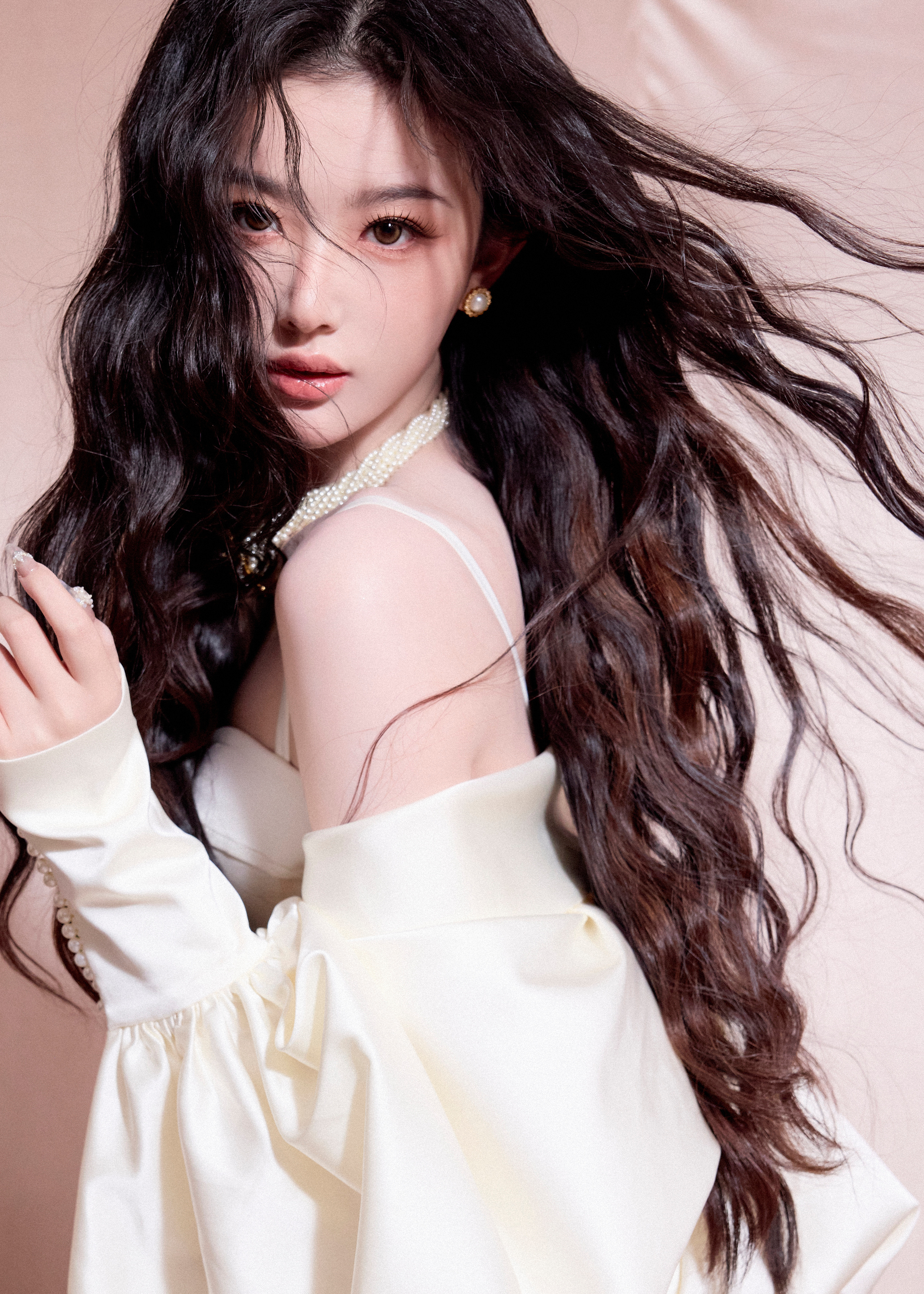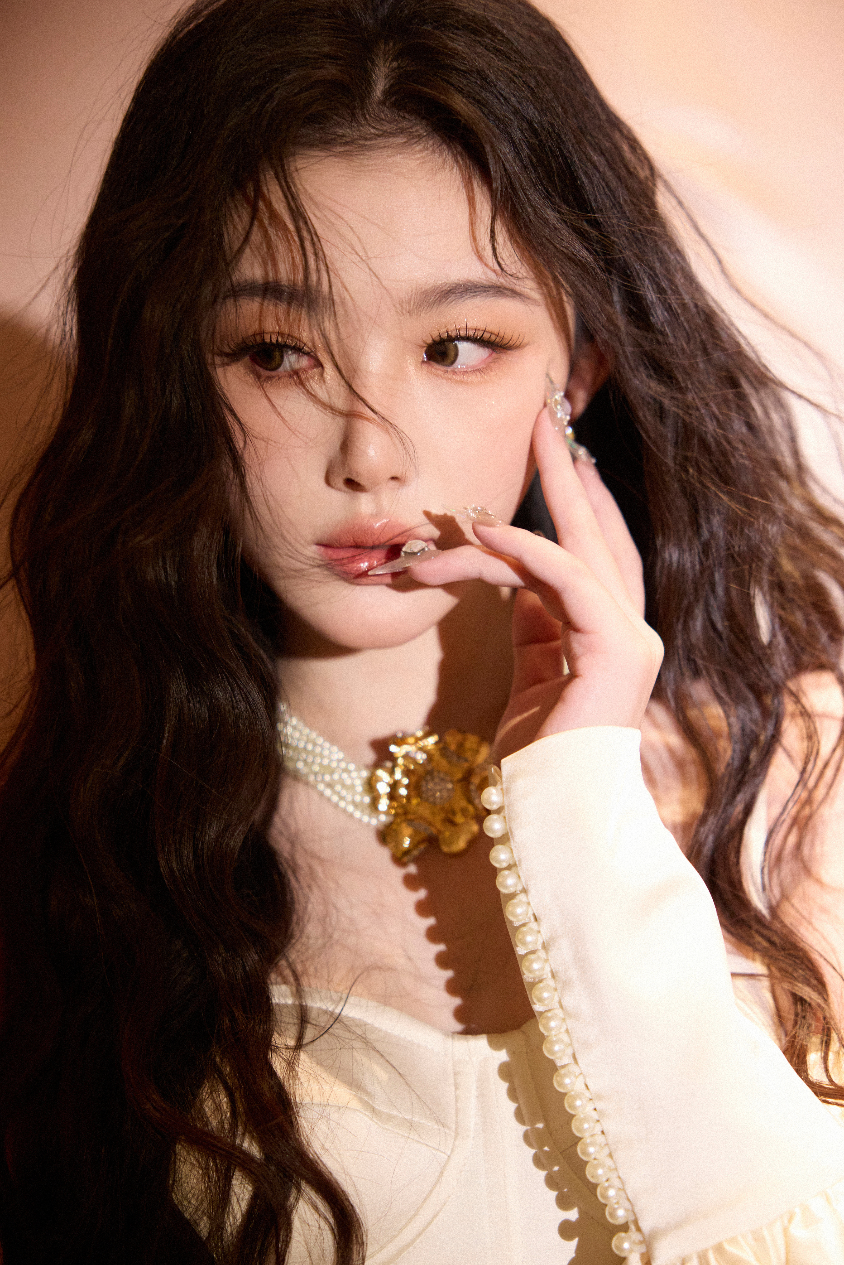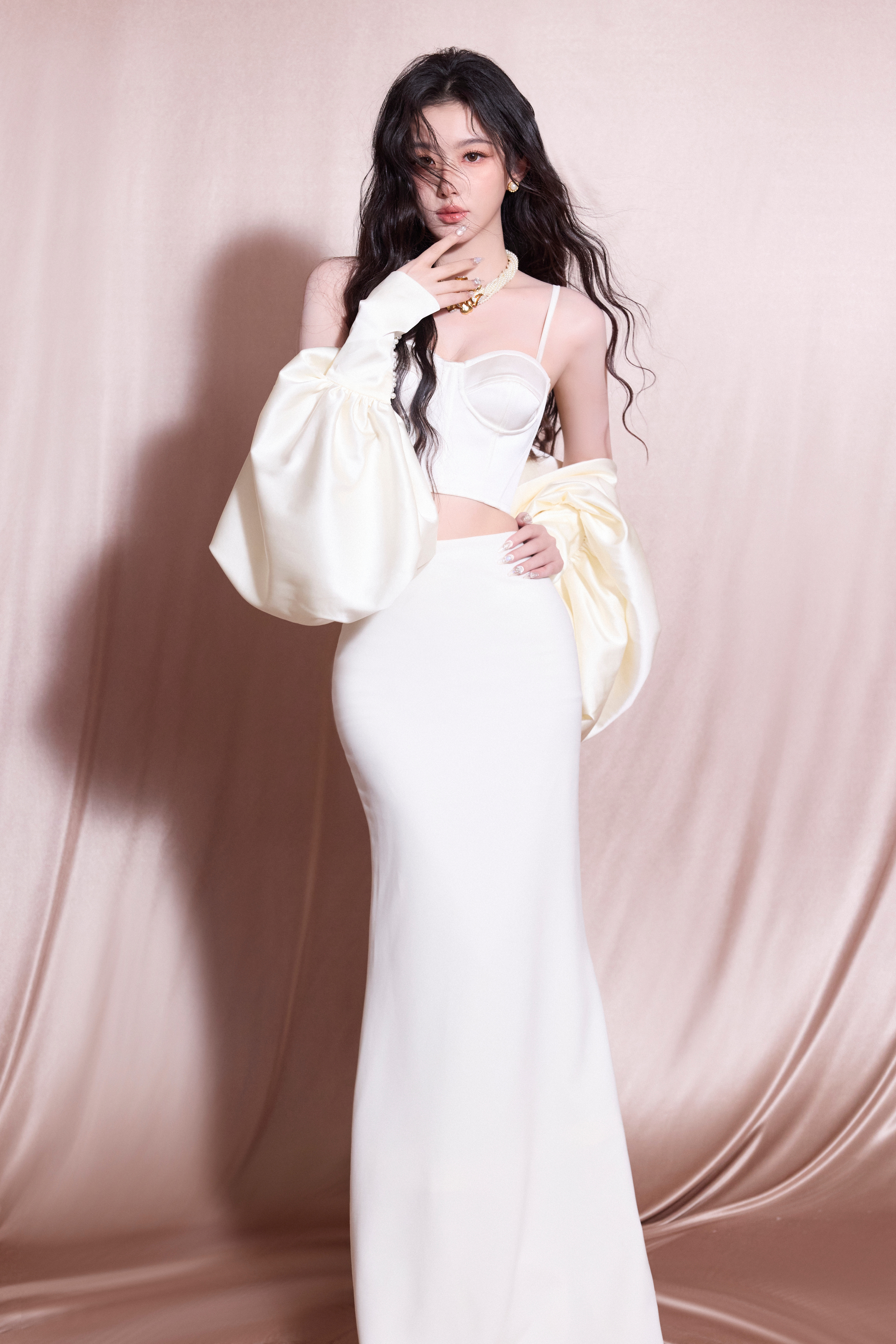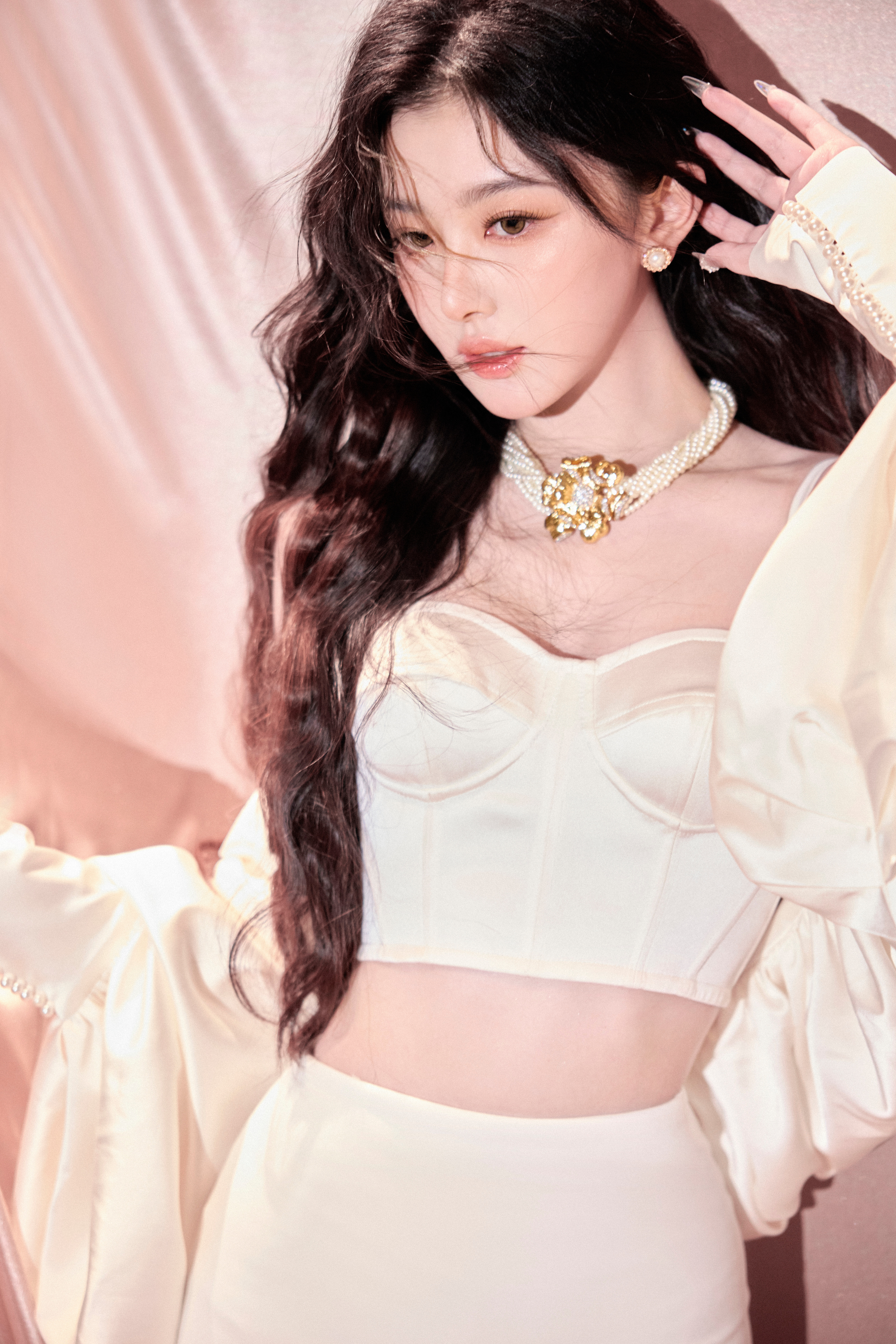 孔雪儿 柔缎似月光倾泻,浅粉帷幕间舒展身姿,蓬松袖摆漾着慵懒风致,每缕卷发都裹着柔光,把优雅酿成一帧流动的梦。顶光下的孔雪儿
