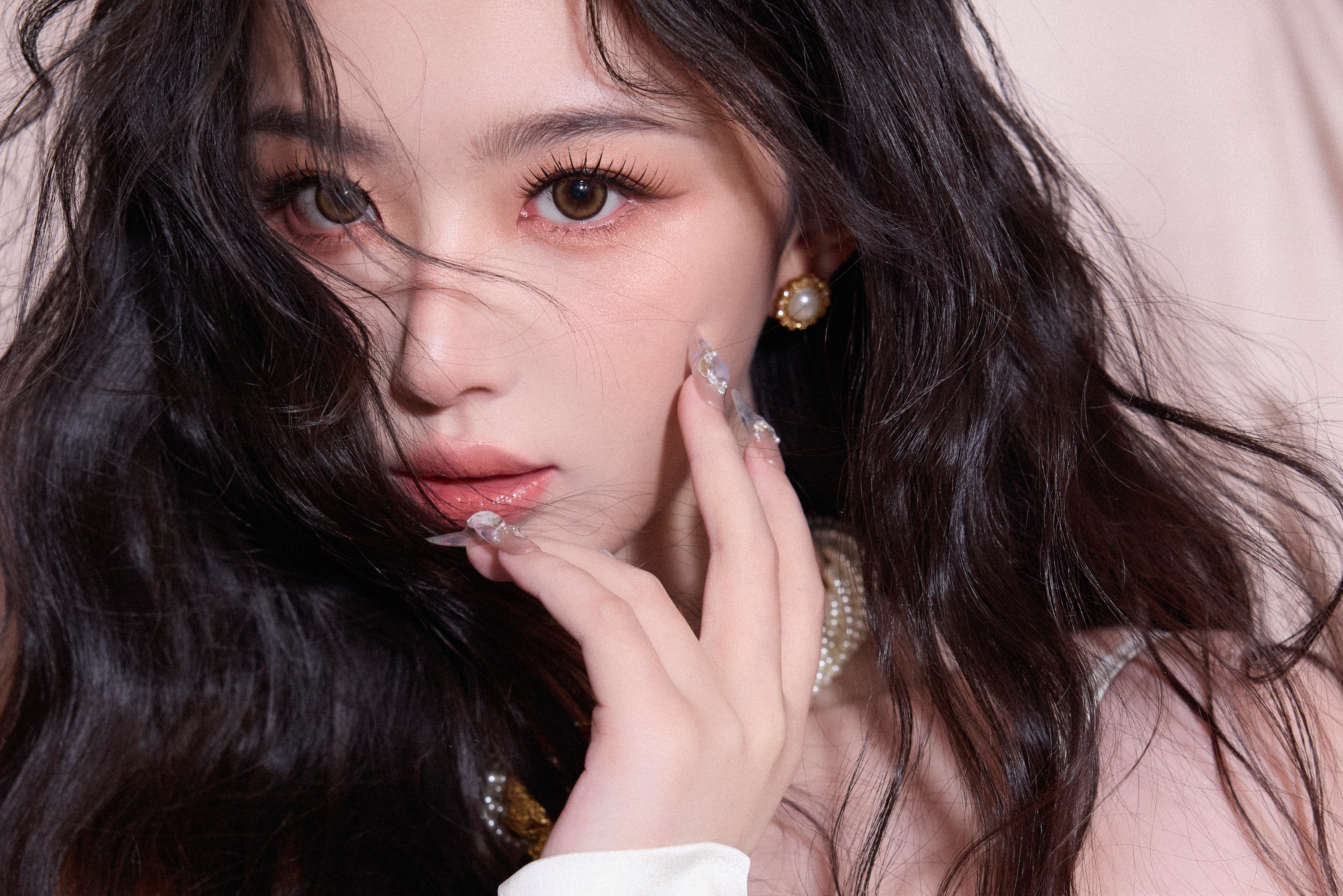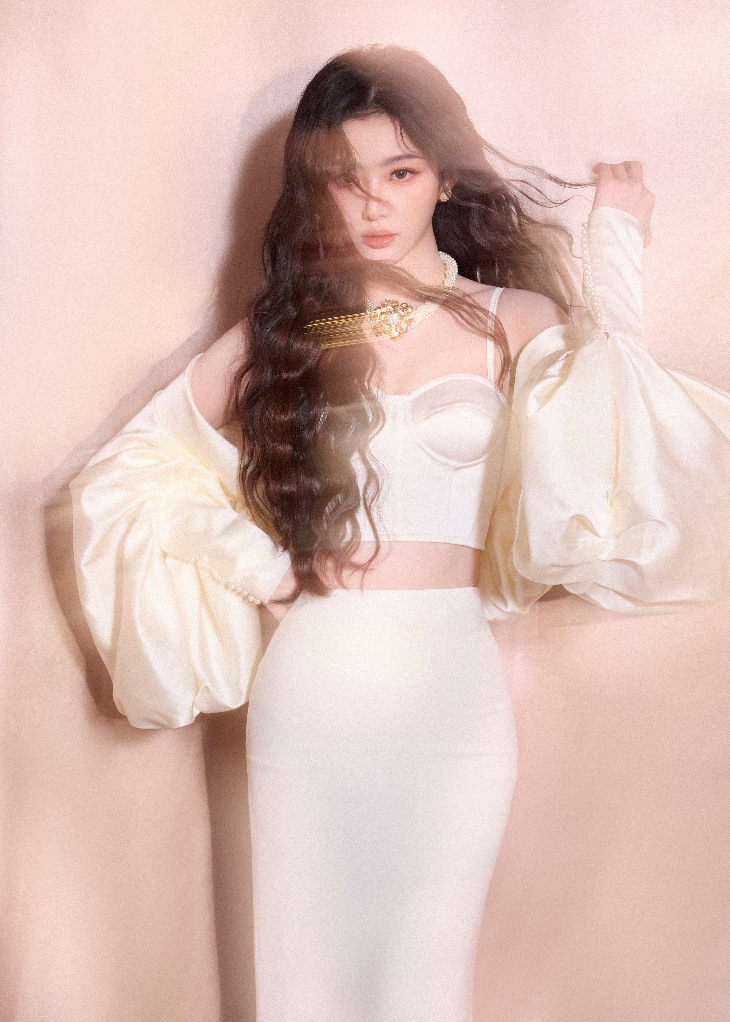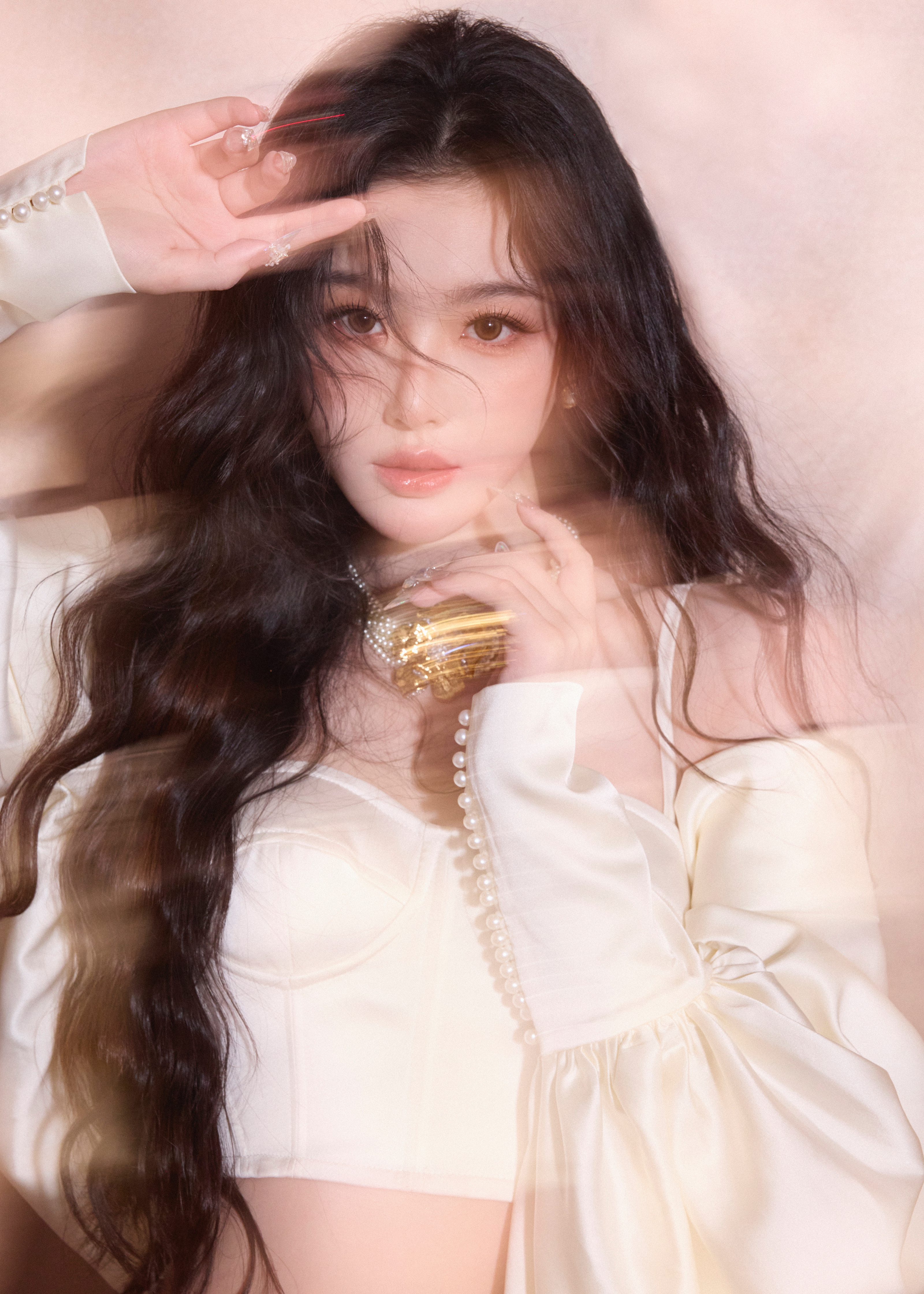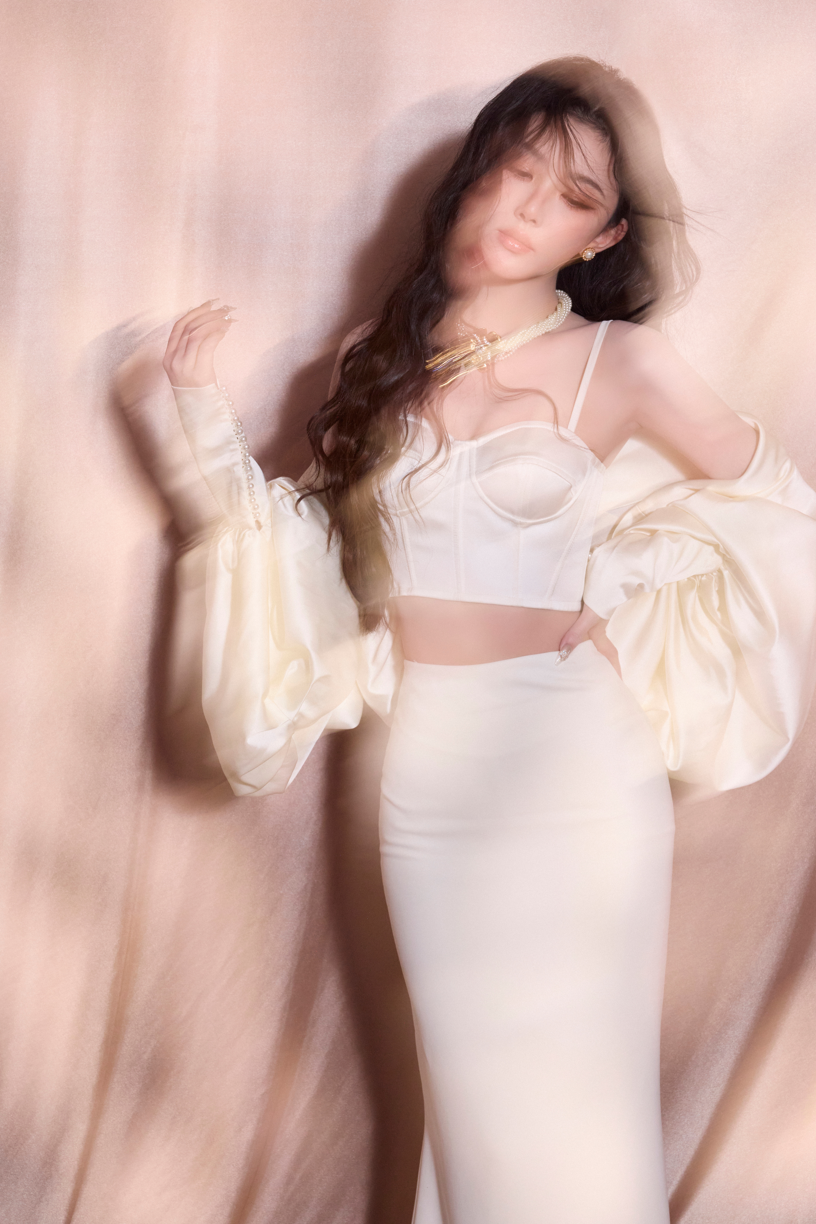 孔雪儿 柔缎似月光倾泻,浅粉帷幕间舒展身姿,蓬松袖摆漾着慵懒风致,每缕卷发都裹着柔光,把优雅酿成一帧流动的梦。顶光下的孔雪儿