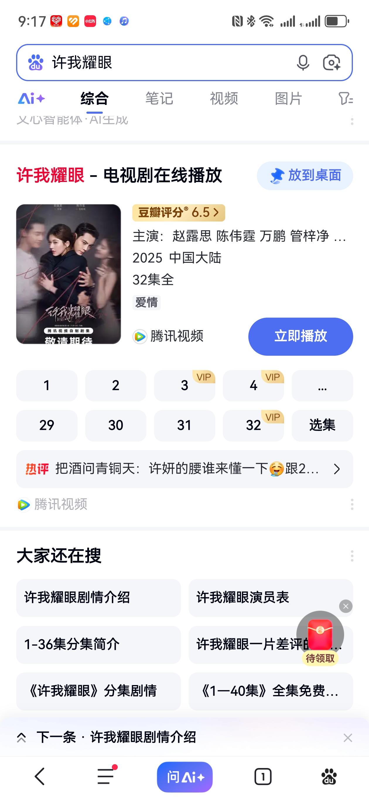 《许我耀眼》追完了这部电视剧,完觉得评分有点低。 这部剧挺吸引人的,满足了好多的元素。 1霸道总裁,陈伟霆的霸总 2假千金,赵露思为了和霸道总裁门当户对不得不伪造个假千金的人设。 3讨好婆婆,顺利协助霸道总裁公关,职场上步步为营。身份一次次差点被拆穿,看得心惊肉跳的。也感觉女主好辛苦。 4终于她决定卸掉伪装,却得知原来霸道总裁的亲弟弟其实是私生子。原来她假千金的身份,霸总早知道。 5女主愤然离婚,搞事业。 6女主去做了网络带货女主播,霸总母亲,弟弟都觉得女主好,鼓励霸总重新追妻火葬场。 7恶毒的女配坏事做尽,喝醉酒暴露了总裁的私生子。 8私生子身份被曝光,孩子备受打击。 9男主女主和好,冲破重重阻碍。 可是恶毒女配说出了又一个扎心真相,原来孩子不是霸总的。养育了十几年的孩子竟然和他没有关系,因为这个孩子他背锅。 当年19岁的他,从国外带回孩子,父母对外称是老年得子。 女配是孩子的亲小姨,当年姐姐告诉她怀孕了,孩子有可能是一个华人画家的,不知道联系方式。 女配姐姐生下孩子,潜水死了。 女配爱上了霸总就私自换了亲子鉴定。 这部剧挺精彩的,有兴趣的可以追一下。许我耀眼 许我耀眼观后感