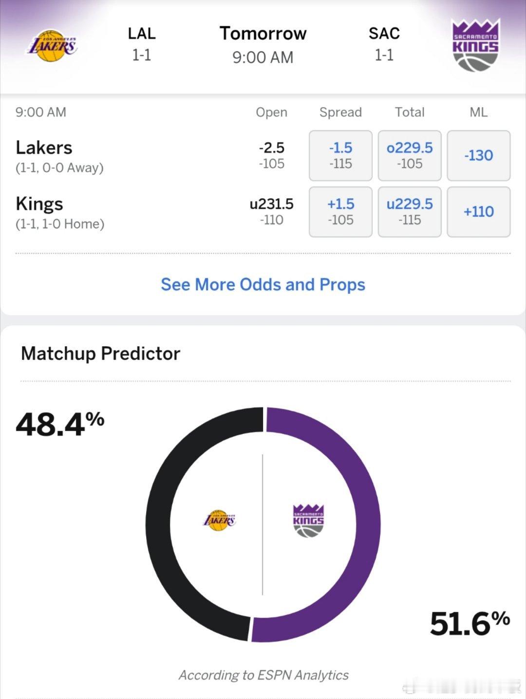 能否取得客场开门红?ESPN预测明日湖人vs国王胜率:湖人48.4%,国王51.