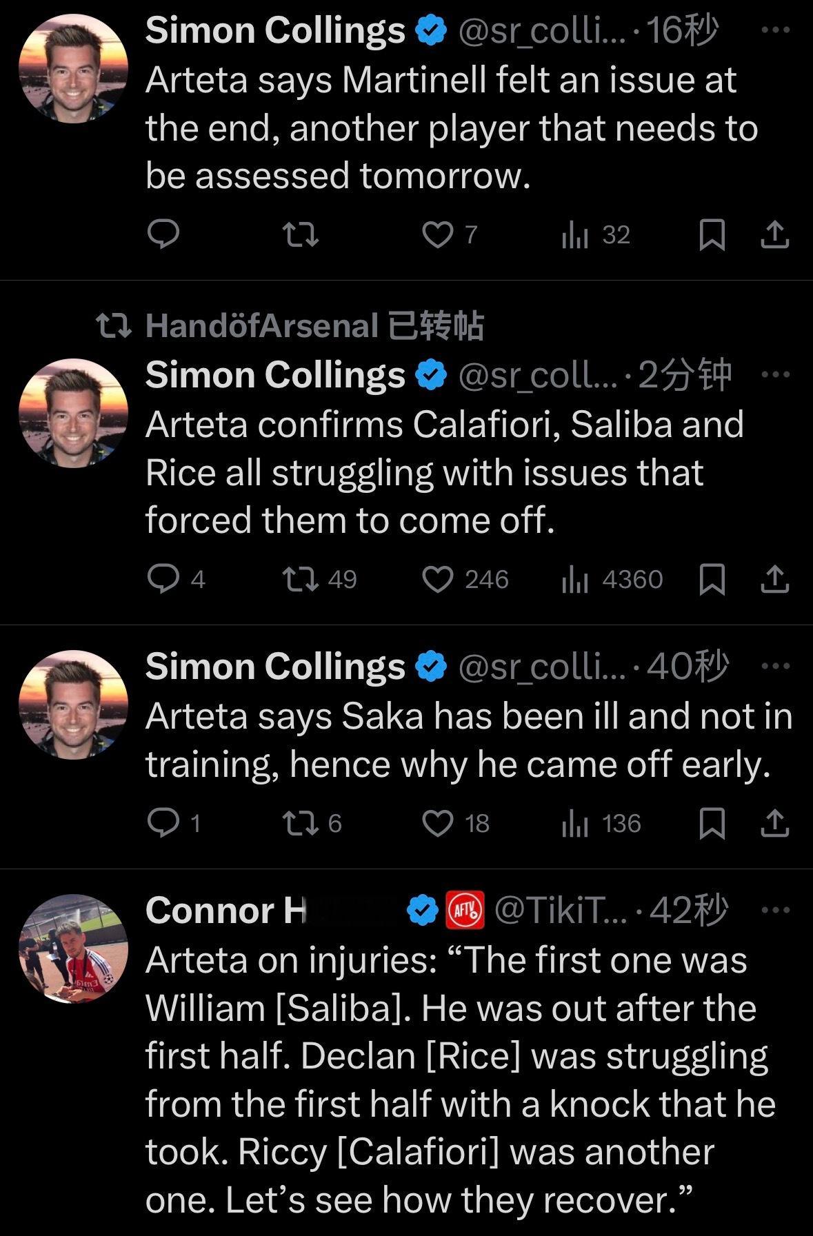 阿尔特塔赛后确认萨利巴、赖斯(上半场碰撞)、卡拉菲奥里、马丁内利(比赛尾声时)均不同程度受伤,具体位置和严重程度未透露,明天将接受检查和评估。