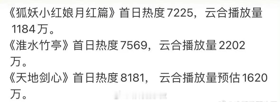 杨幂、龚俊《狐妖小红娘月红篇》首日热度7225,云合播放量1184万。