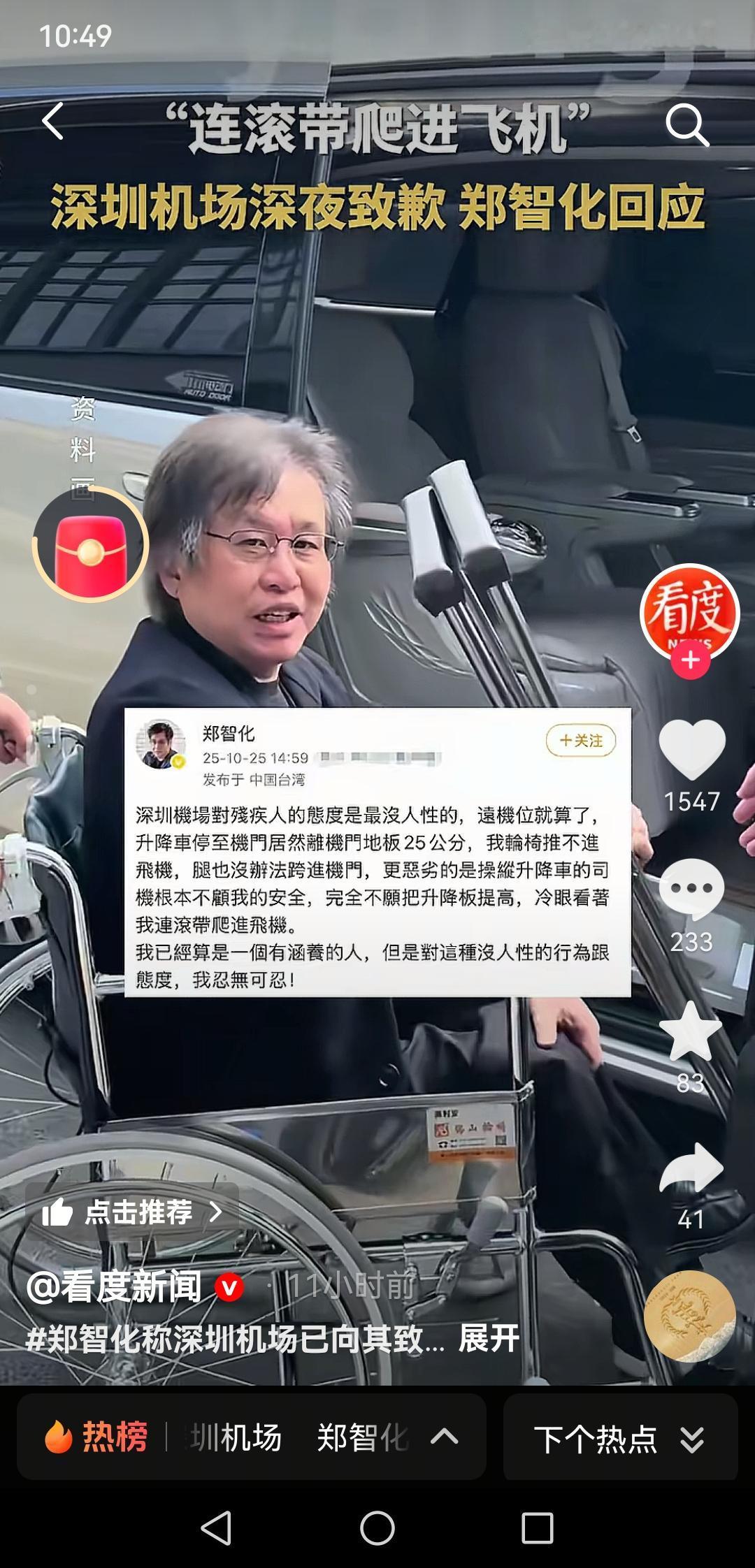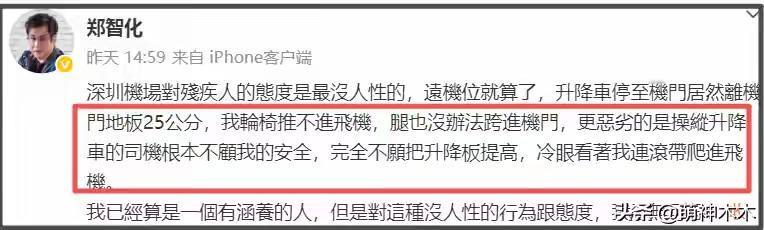其实对于在台湾省大放厥词,怼天怼地的人,我们一定要谨慎对待! 这类人大多数都是性格乖张,甚至扭曲。以自我为中心。他们会利用所处环境的漏洞和优势博出名和出位。他们大多数欺软怕硬,得理不饶人!他们懂得到哪座山唱什么歌,他们更懂得带普通民众节奏。倘若这次深圳机场没有及时放出他上飞机的监控视频,深圳机场估计会被骂的连滚带爬屁滚尿流。 郑智化这次对深圳机场的愤愤不平,其实是他多年因为其残疾人身份在安检过程中遭受的各种不便积聚情绪的集中释放。 深圳机场很及时的放出他登机时受到机场工作人员的搀扶服务,绝大多数网友认为机场方面并无不妥。 其实机场严格安检也是一把双刃剑,这一切都是血淋淋的经验和教训才会形成如此严苛的安检过程。 比如他在新疆机场因为拐杖的事情被各种不便,但是新疆机场确实遇到过金属拐杖导致的安全问题。 现在中国作为全世界最安全的地方,和严苛的机场地铁安检过程分不开的,包括禁枪,刀具的管制等等!这些严苛的管制有时候确实给我们生活带来些许不便,但是确实给大环境规避了许多安全隐患! 而他作为我们台湾省小地方的艺人,我们都发展成让他们要仰望的高度,他们脑袋还是停留在几十年前一副居高临下样子。其实他这样的过气艺人会有这样那样的情绪也是可以理解的,毕竟在星星点灯爆火的那些年,他在祖国大陆应该是全民偶像,现在估计在机场也没有几个人认识他。这种落差自然会让他心情不是那么好!