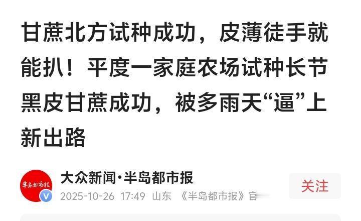 平度农妇逆袭记:北方甘蔗徒手扒皮爆红网络,多雨天逼出千万级致富新思路! (來源:半島都市報) 秋风掠过平度的田野,马焕伟的甘蔗林沙沙作响。这片曾因雨水淹没猕猴桃的土地,如今挺立着节长杆粗的黑皮甘蔗,像极了她的人生——在绝境中拔节生长。当南方水果贴上“北方种植”的标签,好奇的网友挤进直播间,看她徒手撕开甘蔗皮,汁水溅出的瞬间,屏幕前的味蕾已被点燃。 “这甘蔗甜得不像话!”一位驱车百里的顾客现场啃着甘蔗感叹。北方的昼夜温差让糖分沉淀更充分,长达七个月的生长期铸就了15度的甜味奇迹。马焕伟举着剥皮的甘蔗笑道:“咱北方人种地,就得和老天爷斗智斗勇。”去年那场大雨淹垮猕猴桃园时,她蹲在泥地里哭过,但很快抹掉眼泪,转身研究起甘蔗的耐寒特性。 种植甘蔗像养孩子,细节决定成败。每天清晨五点,马焕伟钻入甘蔗林褪叶,让阳光亲吻每一节杆茎。她不用除草剂,徒手拔草磨出厚茧;坚持施农家肥,土壤里飘着秸秆发酵的醇香。网友戏称她的农场是“北方甘蔗实验室”,而她却说:“土地不骗人,你舍得流汗,它就给你甜头。” 直播镜头下,马焕伟的坦诚成了流量密码。她直言阴雨会影响顶端甜度,但霜降后的甘蔗反而更脆甜。这种“不完美真实感”反而赢得信任,订单从山东蔓延至东北。一根甘蔗25元,自采仅15元,价格背后是农人对品质的倔强——宁可少赚,也要让北方人吃上现砍的甘蔗。 逆境逼出创新。马焕伟摸索着用地窖储存甘蔗种,像守护火种般控制温度湿度。若试验成功,明年扩种计划将带动邻村一起致富。有网友调侃:“这哪是种甘蔗,分明是写北方农业逆袭剧本!”而她的回复朴素有力:“地里长出的希望,比啥都踏实。” 如今,农场成了网红打卡地。孩子们举着甘蔗奔跑,老人回忆起几十年前吃南方甘蔗的稀缺。马焕伟的账号“平度小桃妹”粉丝破万,每条视频都涌动着共鸣——人们看到的不仅是甘蔗,更是一个普通农妇与天较劲的韧性。有评论写道:“看她徒手扒皮的样子,我突然懂了什么叫‘双手创造生活’。” 这场北方甘蔗的“破壁”之旅,折射出中国农业的微光。当气候无常成为常态,农人用智慧与土地对话,在直播间里重构产销链条。马焕伟的甘蔗林或许只是5亩地的试验,却扎下了产业更新的根——它告诉每一个在风雨中前行的人:绝望处必有新路,只要敢把种子埋进春 天。 青岛身边事青岛生活