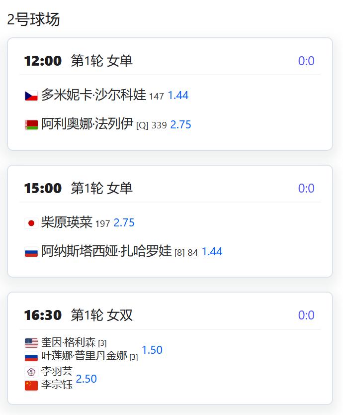 今日赛程: WTA250赛九江站,女单第一轮,从资格赛突围的郭涵煜将在首轮对阵科尔涅耶娃; 持外卡参赛的郑妩双将对阵斯塔罗杜布采娃; 韦思佳将对阵6号种子邦达尔; 女双第一轮,持外卡参赛的侯亚男/朱宸汀将对阵奥恰伦科/韦布利; 李宗钰/李羽芸将对阵3号种子格利森/普里丹金娜; WTA250赛香港站,女单第一轮,王雅繁将对阵资格赛球员英格丽斯; 从资格赛突围的马烨欣将对阵布克沙; 女双第一轮,马烨欣/张莹将对阵王曦雨/尤晓迪。