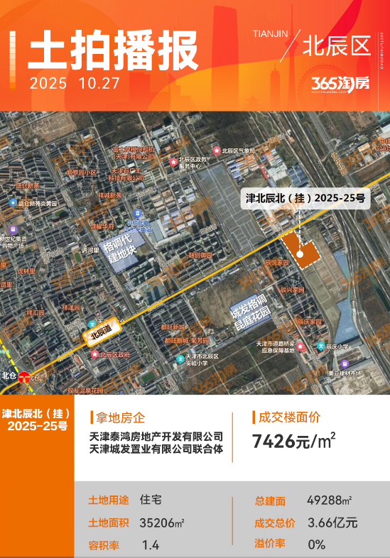 北辰又上新,津北辰北(挂)2025-25号地块被天津泰鸿房地产开发有限公司、天津城发置业有限公司联合体以3.66亿底价摘得,成交楼面价7426元/平米。 容积率1.4,可以做洋房社区。 这地块为格调代建。 若再加上,城发格调昆庭花园、8月底出让的津北辰高(挂)2025-24号地块,以及上周六刚刚公布案名的格调观骊(天津商业大学地块),现在格调在北辰已经有4个盘了。 换个角度,这也预示,北辰不会打价格战了。 都是自家的,手心手背都是肉。
