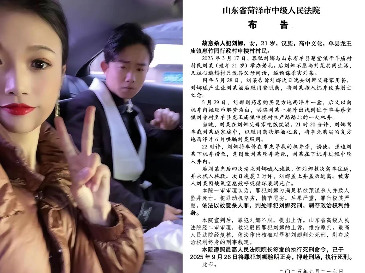 这个就是山东菏泽的刘娜!外表看来人畜无害,但她出嫁才两个月时间,就把丈夫残忍杀害了。 说起来这事儿太唏嘘,刘娜19岁就被父母催着相亲,跟认识才一个月的男生办了婚礼。婆家掏空家底凑了彩礼、买了婚房,红喜字还没褪色,她就嫌丈夫老实没本事,觉得自己嫁亏了。可她既不敢提离婚怕退彩礼,又怕村里人说闲话让娘家丢脸,愣是把这些不满憋成了杀心。 她偷偷买了安眠药,摸清了村外偏僻机井的位置,丈夫还傻傻对她好,她说想吃啥就立马去买,压根没察觉妻子眼底的狠。那天丈夫说要去丈母娘家吃饭,刘娜觉得机会来了,饭桌上不停劝酒,又骗丈夫吃了6片“解酒药”。返程时故意绕路到机井旁,编了个抛硬币解梦的由头,又哄丈夫下井捞鲫鱼,迷糊的丈夫刚爬两步就坠了下去。 井里传来呼救声,刘娜就站在上面听着,还开车往返几次确认动静,直到没声了才盖上井盖回家。结果第二天丈夫尸体就被发现,药店记录、行车路线、面对警察的慌乱,全成了铁证,一审判死刑,上诉也被驳回,2025年9月26日,21岁的她终究为自己的恶付出了代价。 现在想想,要是当初没人催着早婚,要是她能有别的办法解决问题,两条年轻的生命也不会走到这步。