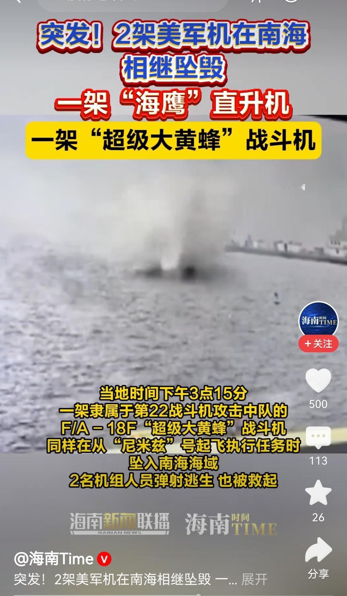 南海:强烈谴责,老美为什么非要在我这掉两架战机,考虑过我的感受吗? 老美:你…… 超级小黄蜂:是哪个大傻子,非说我和刚刚掉进海里那兄弟长的不一样,非得让我也飞一飞,给他找找规律。 航母舰长:我…… 东方大国网友:阴谋…绝对有阴谋。