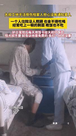 人间自有真情在! 辽宁鞍山,一名小伙在住院期间,发现同病房的大叔一个人躺在床上,既没有老伴,又没有子女来陪伴。大叔自个照顾自己,舍不得吃喝,经常吃上一顿的剩菜,甚至晚上还不吃。 大叔是甘肃来的,在工地上干活,不小心从脚手架上摔下来,手和脚都受伤了。他怕家里人担心,就没告诉任何人,自己一个人在医院呆着。 工地上的活是又脏又累,大叔也不抱怨,每分钱都用在刀刃上,连吃饭都很节俭,经常吃剩饭剩菜。 医院的一位护士小姐,发现大叔这一情况后,就每天按时按点给大叔打饭,一日三餐,还对大叔说,我们的饭是用饭卡打的,免费的。 其实,哪有免费的,是自己掏腰包帮衬的,是护士小姐怕伤了大叔自尊,有意编了这么个善意的谎言。 人间自有真情在,有人看不得人间疾苦,护士的谎言,流露的是默默伸出援手的真情,是不求回报的无私奉献,去帮助需要帮助的人。 生活中这些微不足道的小事,却在别人有难的时候,不动声色地给人以力量,从不张扬,善良从没离我们十万八千里,就藏在不经意的瞬间。 大叔的怕家人担忧,不张扬,护士小姐的默默付出,这种悄无声息的善举,比任何豪言壮语,更能令人温暖。 只要人人心怀善意,世界将更加和谐美好! 大家说是不是这个理?