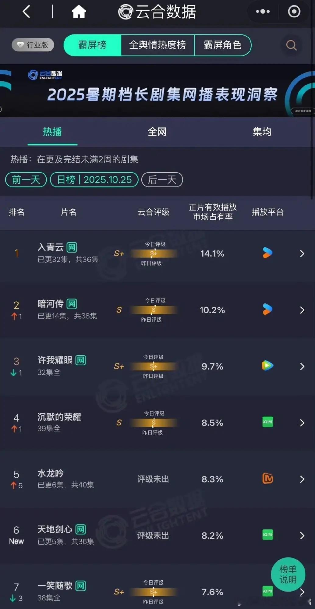 从云合播放量来看,《暗河传》10.4%排名第二,《水龙吟》8.3%排名第五,《天地剑心》8.2%排名第六,除了成毅的《天地剑心》爆开,其他两部不是很妙!