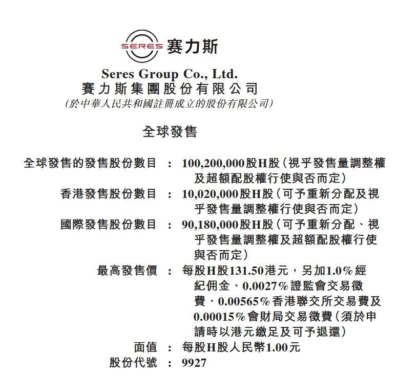 赛力斯拟香港上市赛力斯拟11月5日在港上市 每股最高131.5港元
