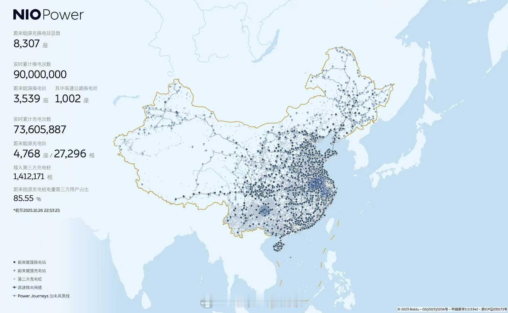 2025年10月26日22时53分25秒,蔚来换电突破9000万次。