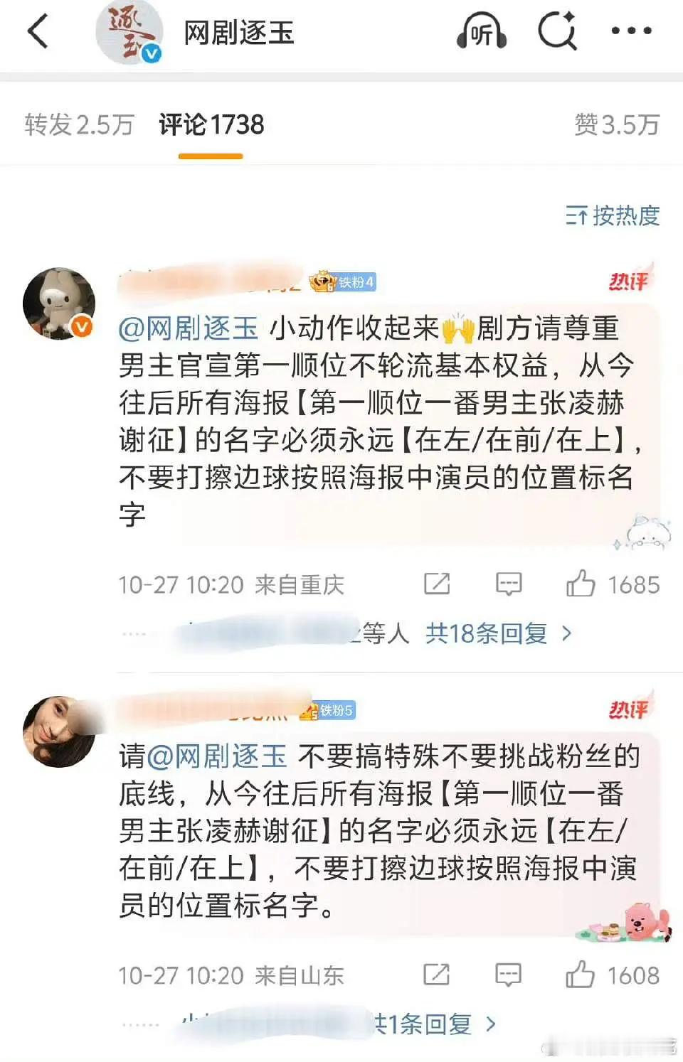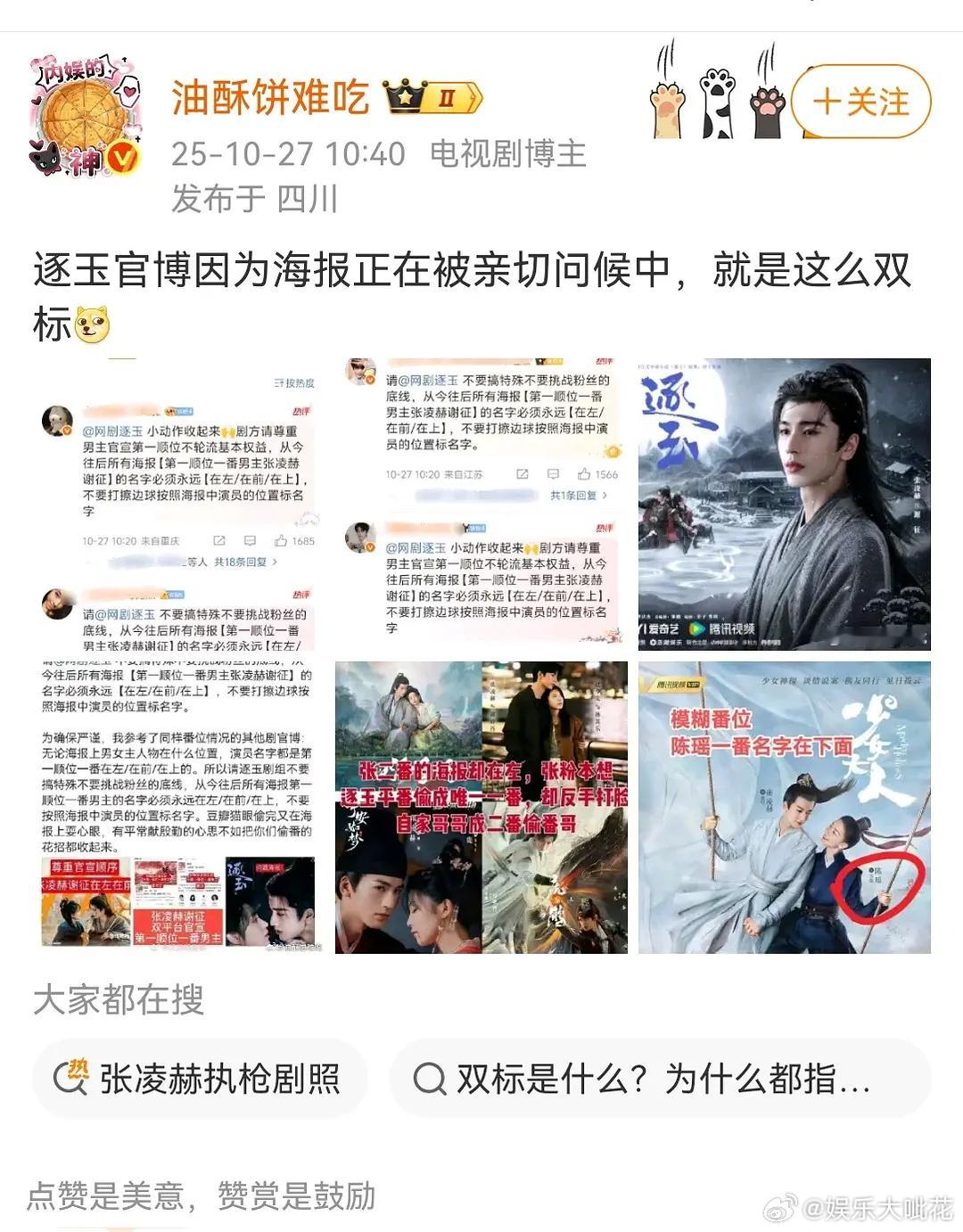 逐玉官博,评论又开撕官博了,疑似因为张凌赫作为男主的海报待遇问题,这个番位还没确定吗[泪奔]