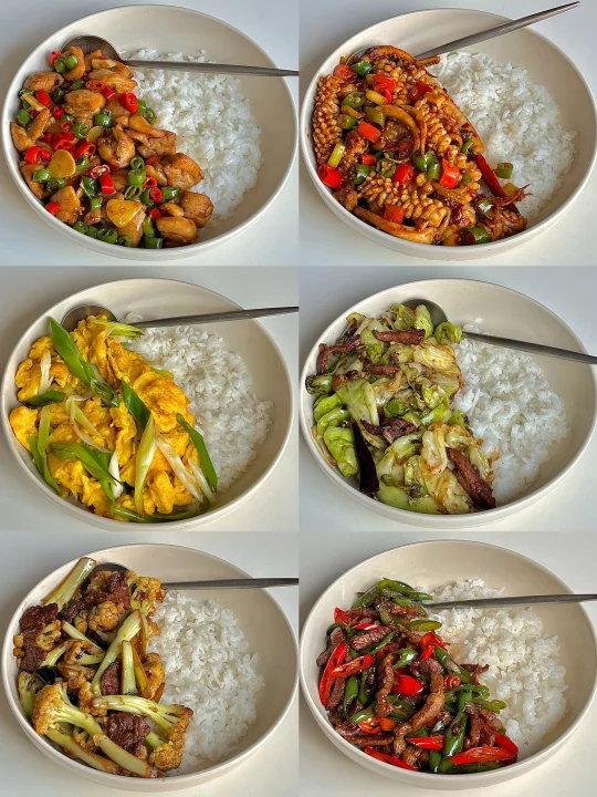 一周家庭版盖饭合集又来喽~ 不知道吃什么的可以来抄作业了 每一道都巨下饭好吃😋 1️⃣农家小炒鸡盖饭 2️⃣火辣鱿鱼盖饭 3️⃣大葱炒鸡蛋盖饭 4️⃣手撕包菜盖饭 5️⃣干锅花菜盖饭 6️⃣双椒炒肉盖饭 . 做法如图上⬆️ 你们喜欢哪一款盖饭呢?