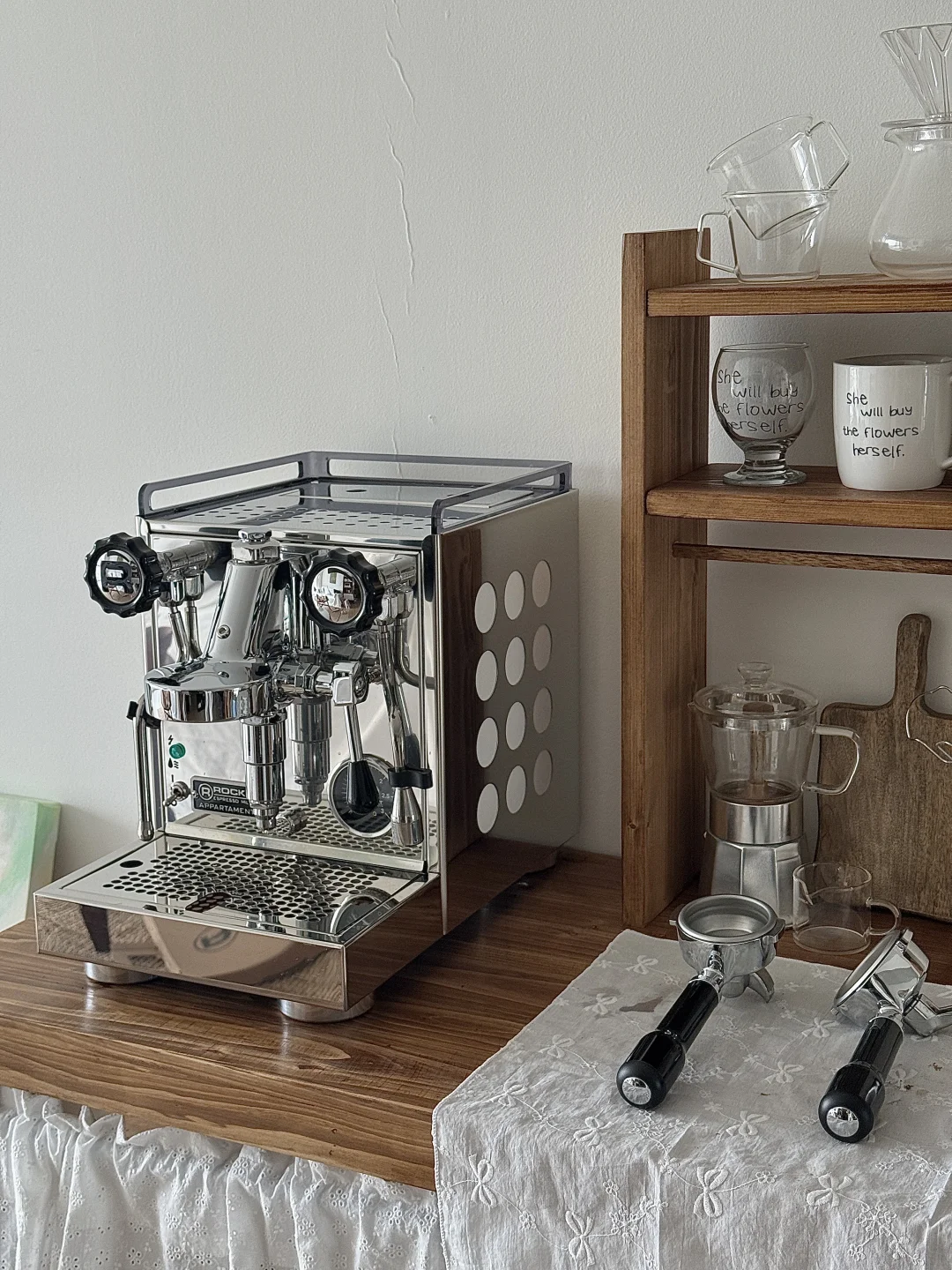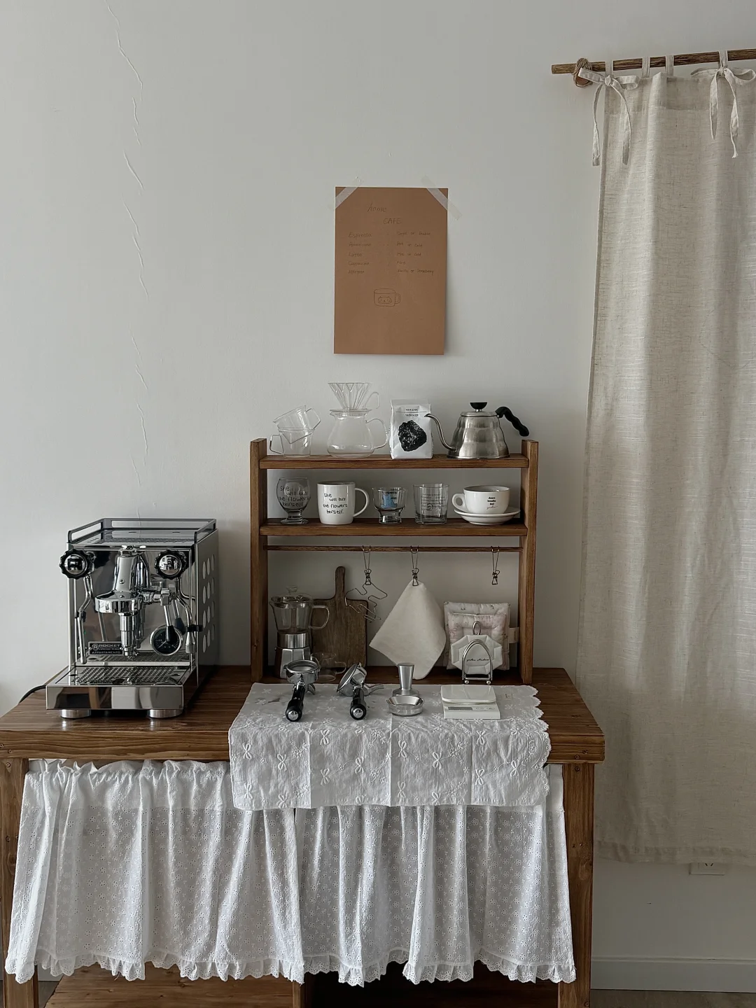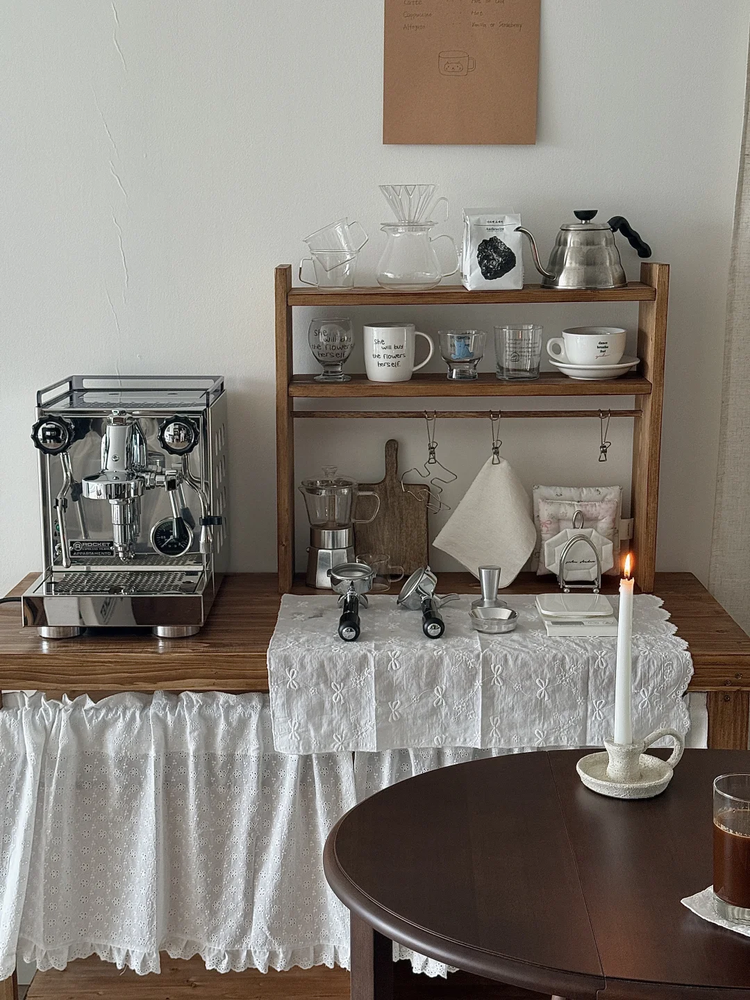 国庆出去玩回家后就一直在鼓捣这个咖啡角 柜子和杯架也都是自己定木头自己做的 第一次做餐边柜没有什么经验 刚做好的时候还觉得尺寸有点点不合适 但布置完很惊喜了 咖啡机是我心心念念喜欢了几年的 终于趁着布置新家拿下了 把家里原本的全自动咖啡机升级成专业咖啡机啦 再摆上一张中古风折叠桌 妥妥的咖啡馆即视感 没想到原本只是想布置一个咖啡角 结果把咖啡馆搬进了家 - 这个咖啡角目前还没有布置好 定的一些其他东西还没有到 后面的墙也还需要再装饰一下 不过现在就已经很好看啦 期待之后越来越完美的效果!