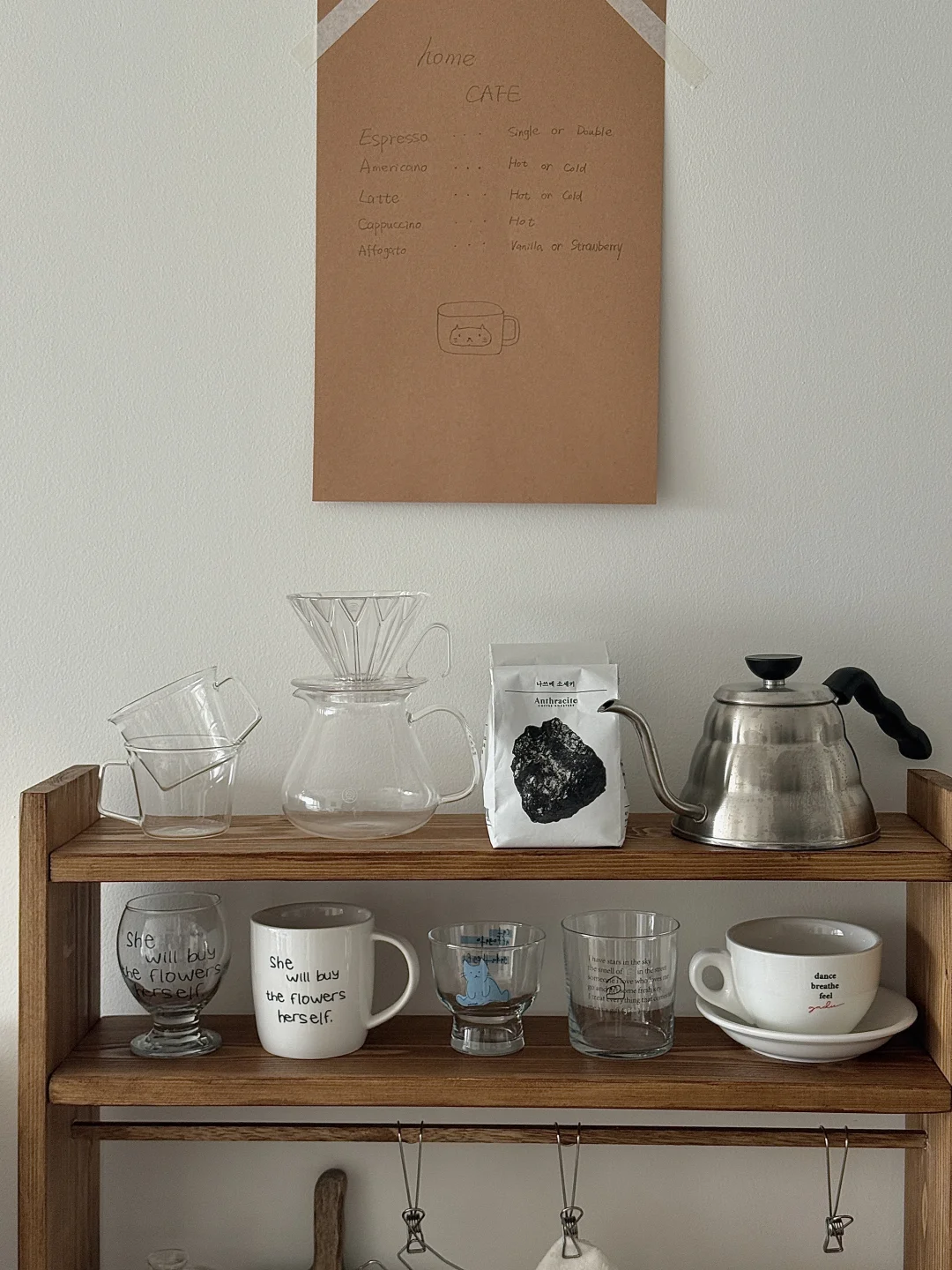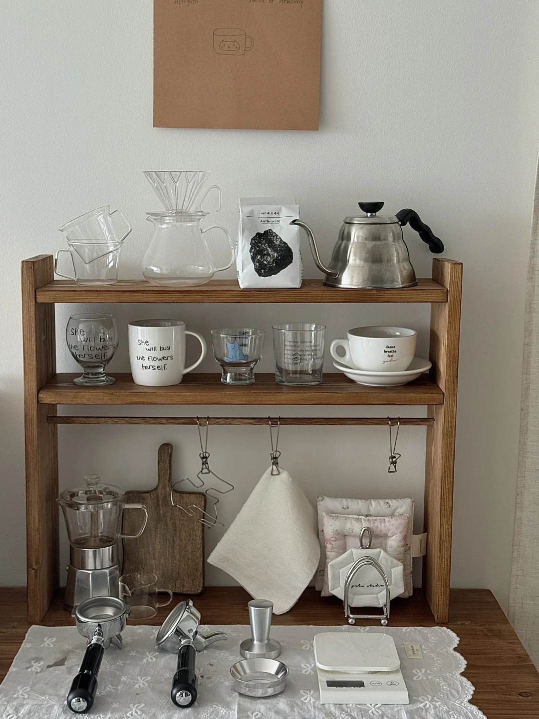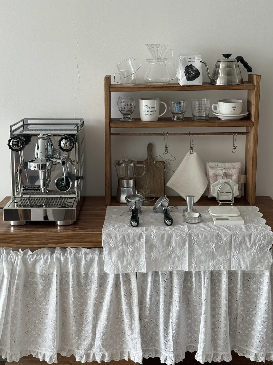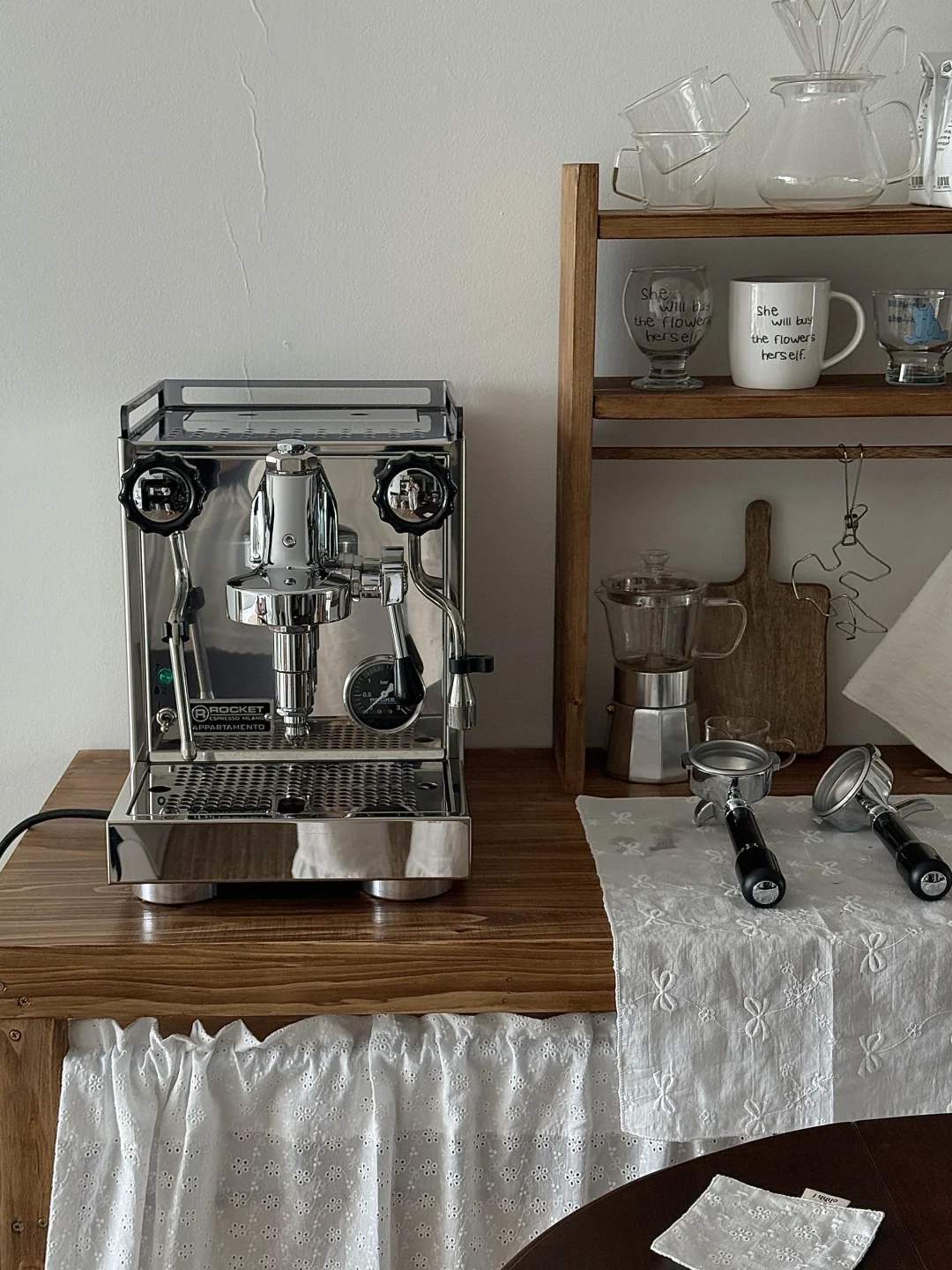 国庆出去玩回家后就一直在鼓捣这个咖啡角 柜子和杯架也都是自己定木头自己做的 第一次做餐边柜没有什么经验 刚做好的时候还觉得尺寸有点点不合适 但布置完很惊喜了 咖啡机是我心心念念喜欢了几年的 终于趁着布置新家拿下了 把家里原本的全自动咖啡机升级成专业咖啡机啦 再摆上一张中古风折叠桌 妥妥的咖啡馆即视感 没想到原本只是想布置一个咖啡角 结果把咖啡馆搬进了家 - 这个咖啡角目前还没有布置好 定的一些其他东西还没有到 后面的墙也还需要再装饰一下 不过现在就已经很好看啦 期待之后越来越完美的效果!