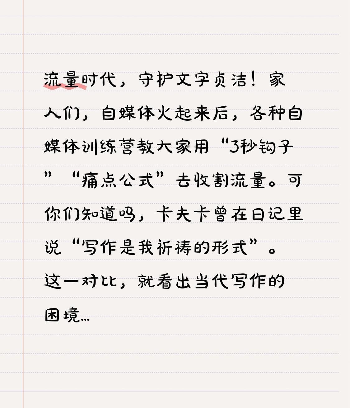流量时代,守护文字贞洁! 家人们,自媒体火起来后,各种自媒体训练营教大家用“3秒钩子”“痛点公式”去收割流量。可你们知道吗,卡夫卡曾在日记里说“写作是我祈祷的形式”。这一对比,就看出当代写作的困境了——在只看重数据的时代,“文字贞洁”成了写作者最后的坚守。 流量让写作变了味 自媒体训练营的“爆款方法论”,说白了就是把文字当成商品。把《百年孤独》开头改成“你绝对想不到的5个婚姻真相”,把张爱玲的苍凉解读成“大女主逆袭指南”。这完全破坏了写作的神圣感: ● 时间上:要求72小时出爆文,哪还有时间沉淀思考啊。想想人家普鲁斯特写《追忆似水年华》用了17年呢! ● 空间上:用“信息密度”指标压缩文本,把留白的美感都弄没了。和汪曾祺《受戒》的从容一比,那些10万+文章全是碎片化的。 文学前辈的坚守 不过,文学史上有很多前辈拒绝向流量妥协,守护着文字的纯粹。卡夫卡临终前要焚毁手稿,他把写作当成神圣的精神仪式;张爱玲在美国公寓独居23年,也不按市场需求改写《小团圆》;佩索阿用72个异名写作,构建出比现实还真实的世界。这说明,伟大的写作是在孤独中诞生的,和流量没啥关系。 写作的真正价值 文字对写作者来说,就像《瓦尔登湖》对梭罗一样重要。 ● 自我救赎:抑郁症患者能通过写日记重建认知,就像茨威格写《昨日的世界》。 ● 存在确证:博尔赫斯盲文写作,证明创作是触摸世界的方式。 ● 精神自治:老舍投湖前还坚持修改《正红旗下》,守护着最后的尊严。 在这个被算法控制注意力的时代,真正的写作者要像守夜人一样。当训练营教大家用“情绪杠杆”博转发时,我们要记住里尔克的话:“写不出时,连一个句子也不该强迫”。文字贞洁不是束缚,而是对写作本质的忠诚。那些10万+文章很快就会被遗忘,只有从心灵深处写出来的句子,才能在时间里留下回响。