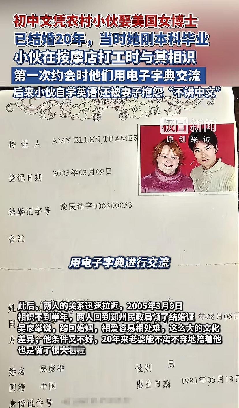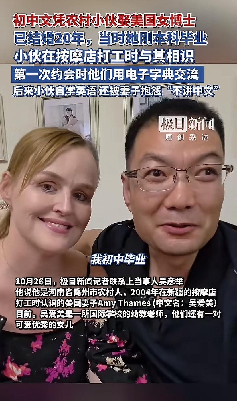 这剧情,电视剧不敢演,20年前农村初中穷小伙,娶了美国博士,更夸张的是在按摩店认识,当时恰巧发生了英雄救美的故事,两人如今有一对可爱的儿女。在人们印象中,本科生娶位女博士都高攀了,两人知识不在一个层级,容易产生认知维度差异,男方有钱也算,她是如何做到不离不弃的,值得向广生女生传授一下。