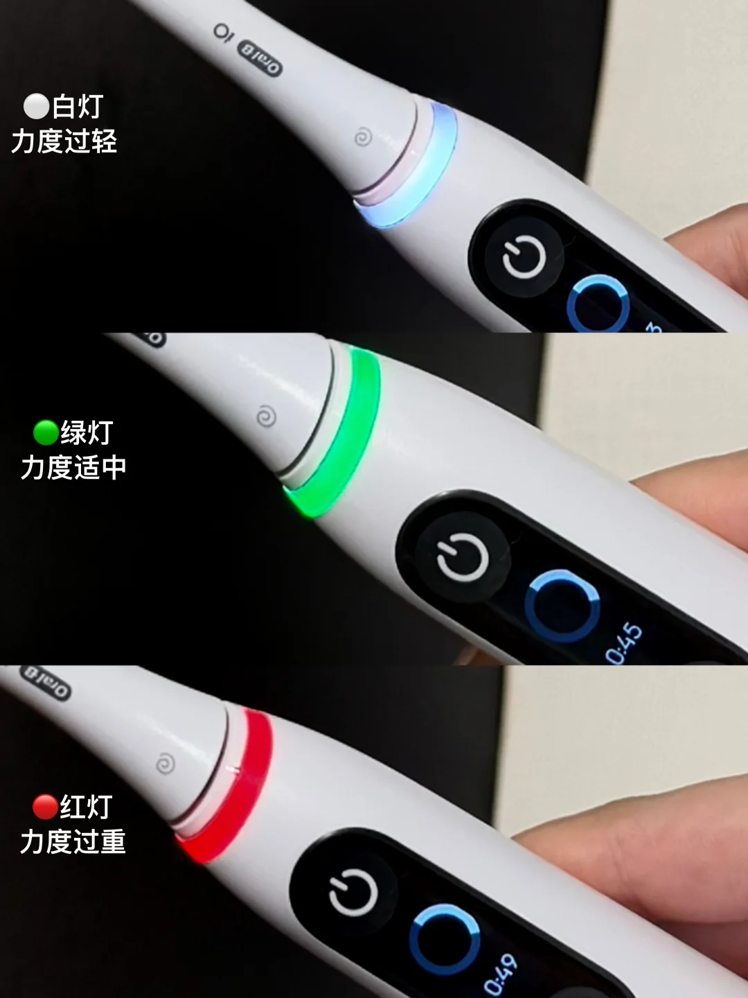 第一次用那个圆头刷,直接给我整懵了!它像长了眼睛一样,温柔又精准地包住每颗牙,里里外外转着圈按摩!!我这个手残党以前死活刷不到的后槽牙缝和牙龈沟,现在我都可以闭着眼就能刷到了?而且它还有个超贴心的护龈灯,我一使劲刷头就闪红光提醒,对我这种肿痛期牙龈敏感的人太友好了,完全不怕刷出血来,然后我如果没有特别使劲的话,就会给我亮白灯,就不担心我没有刷干净了!这下不又能放纵乱吃一顿了(不是
