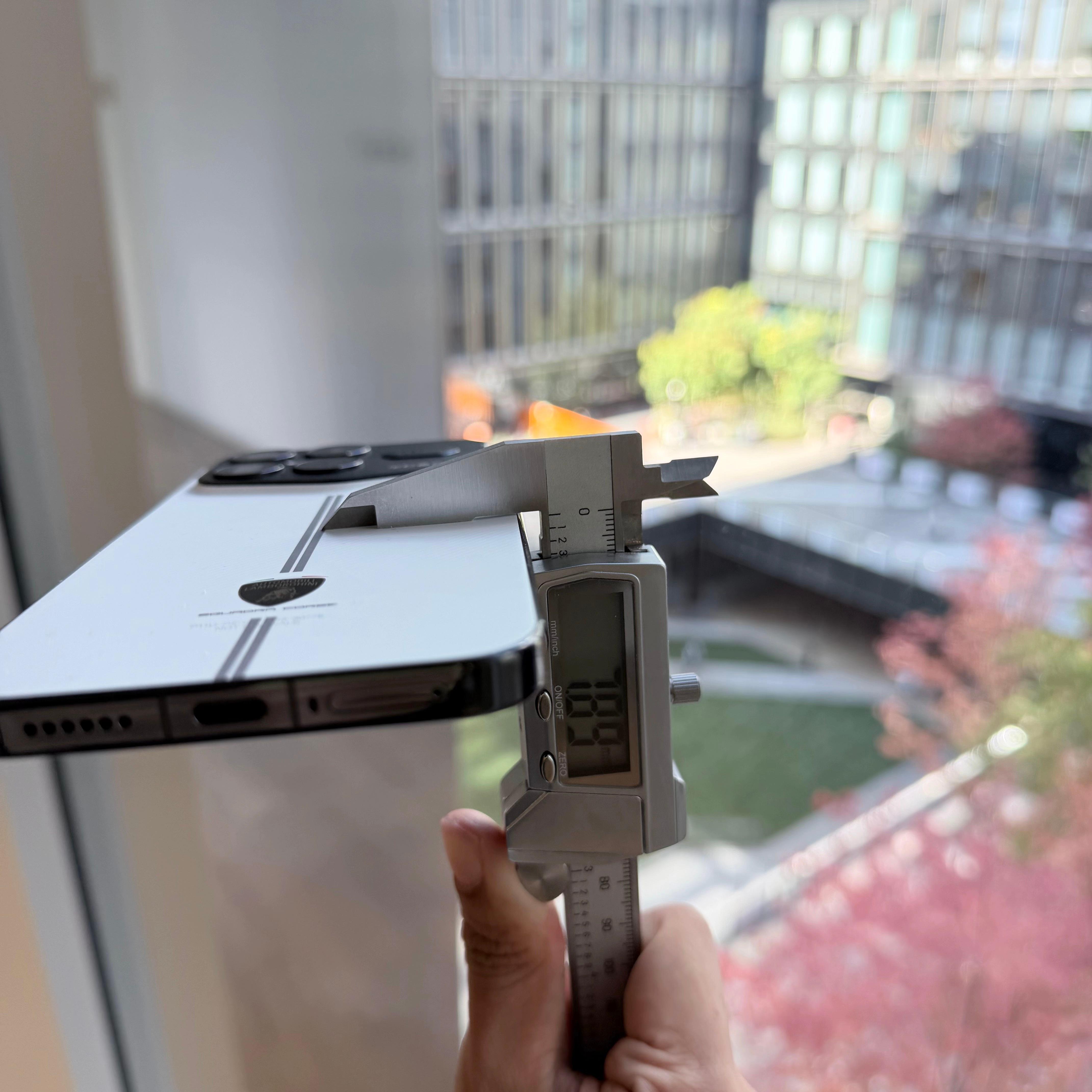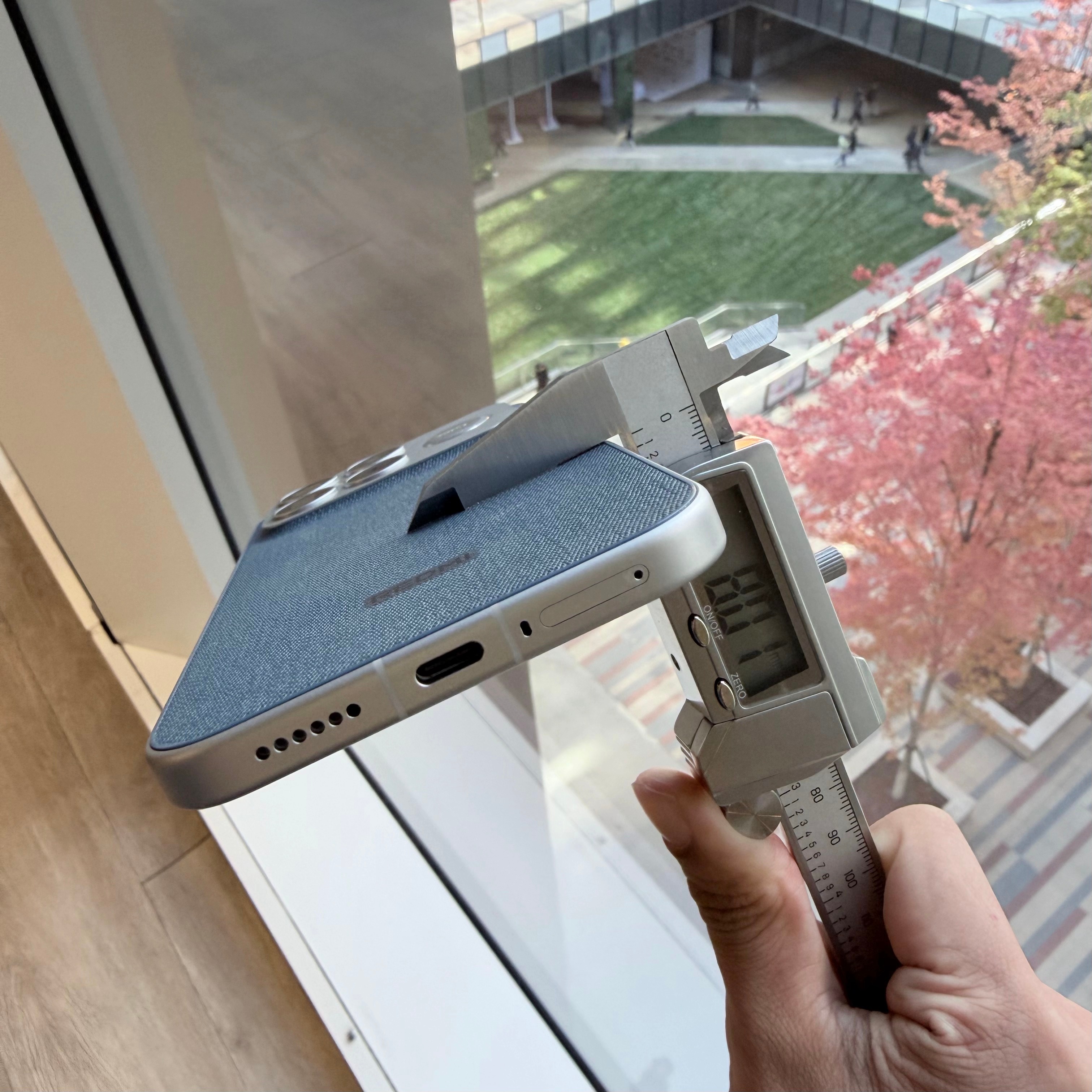 7560mAh的电池,机身(黑/白/冠军版)仅7.9mm;丹宁色的第三代科技纳米皮稍微厚一些,我用卡尺量了一下,8.01mm