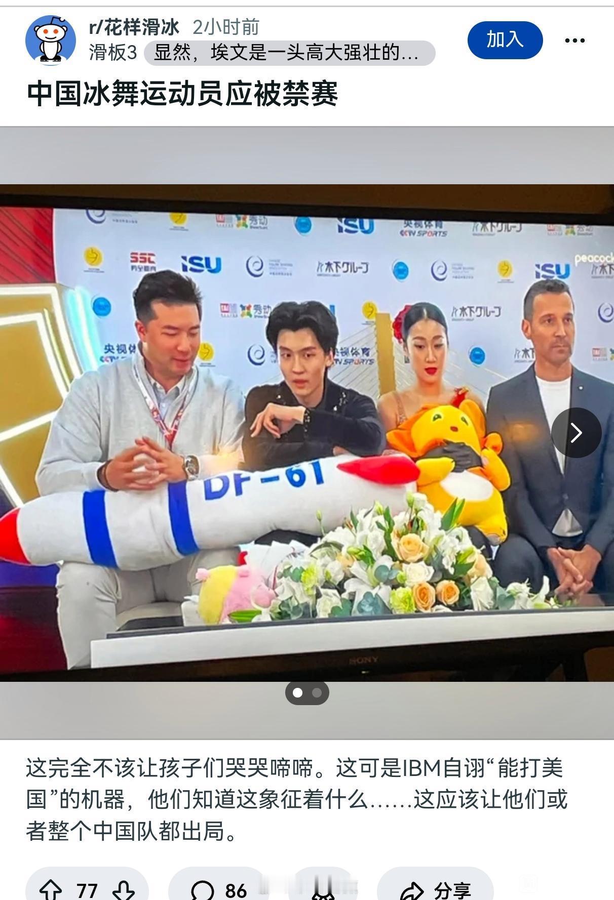 因为中国花滑运动员抱了个DF61的毛绒玩具,美国人有点应激,说要举报“对中国运动员禁赛处罚”……