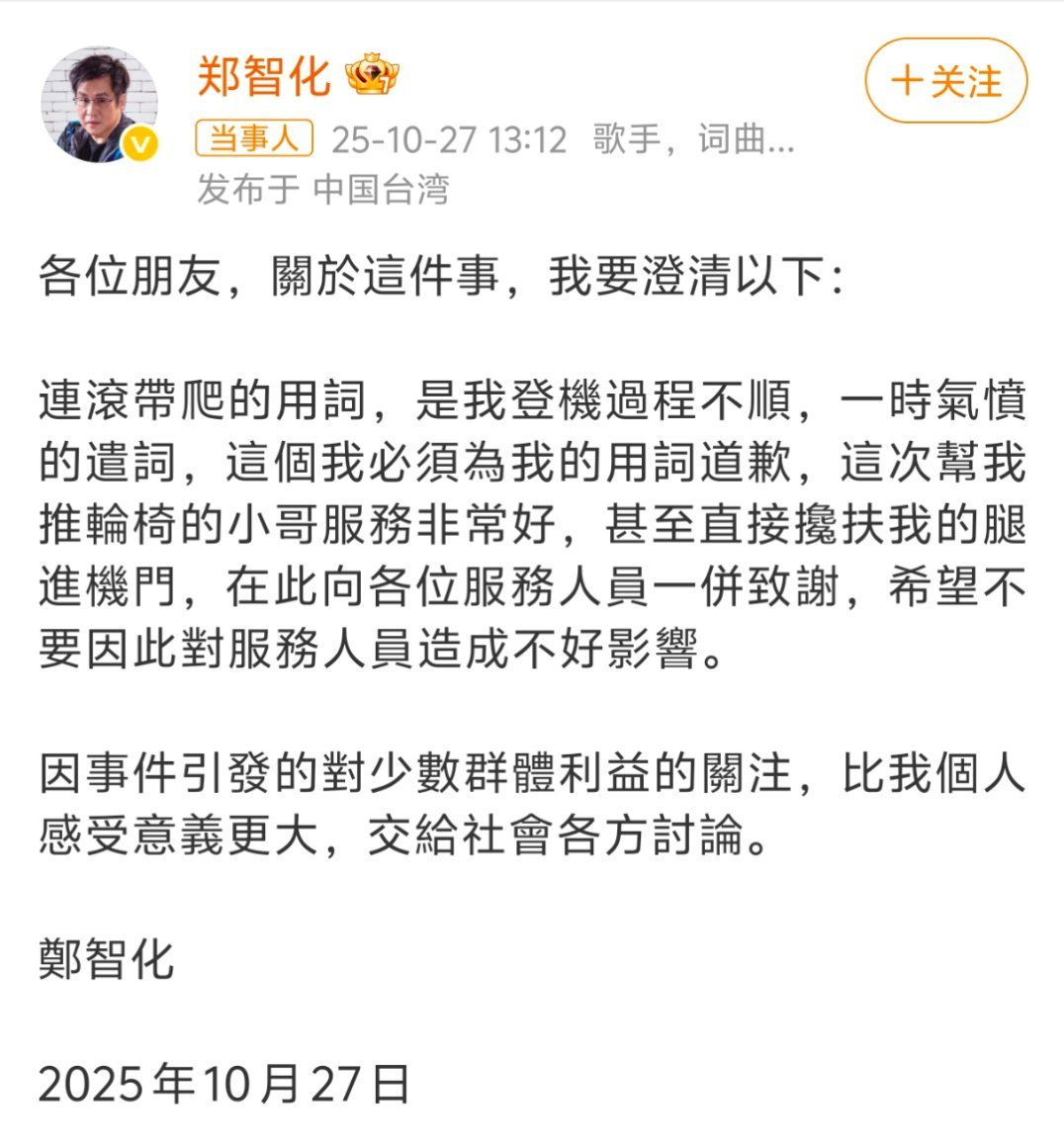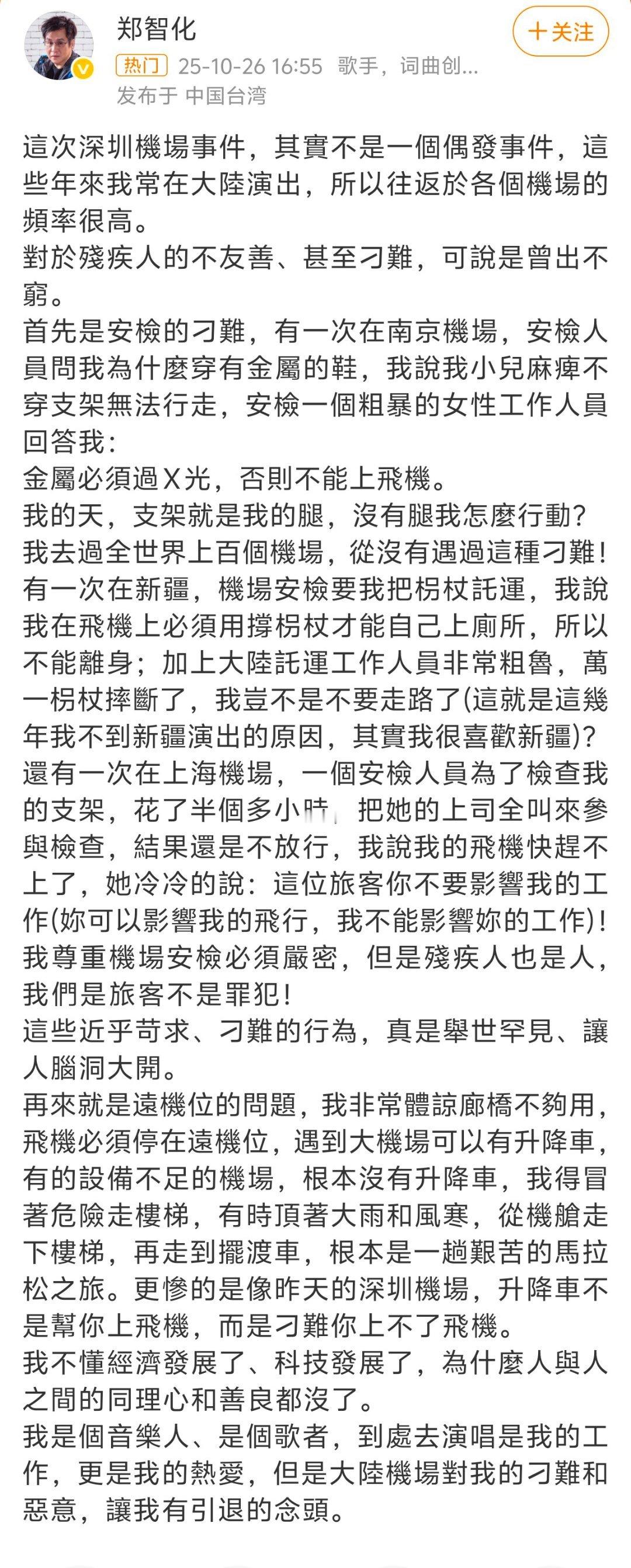 郑智化致歉看了视频当时有四个人在服务他,虽然说有需要改进的地方,但他一句“连滚带爬”让深圳机场挨了多少骂,让那些帮助他的工作人员又有多寒心!我能理解他在气氛情况下去吐槽,去为特殊群体争取利益,但如果视频没曝光,无端指责就是把利剑,刺向尽心尽力帮助他的人!而现在利剑刺向了他自己…郑智化吐槽深圳机场事件背后
