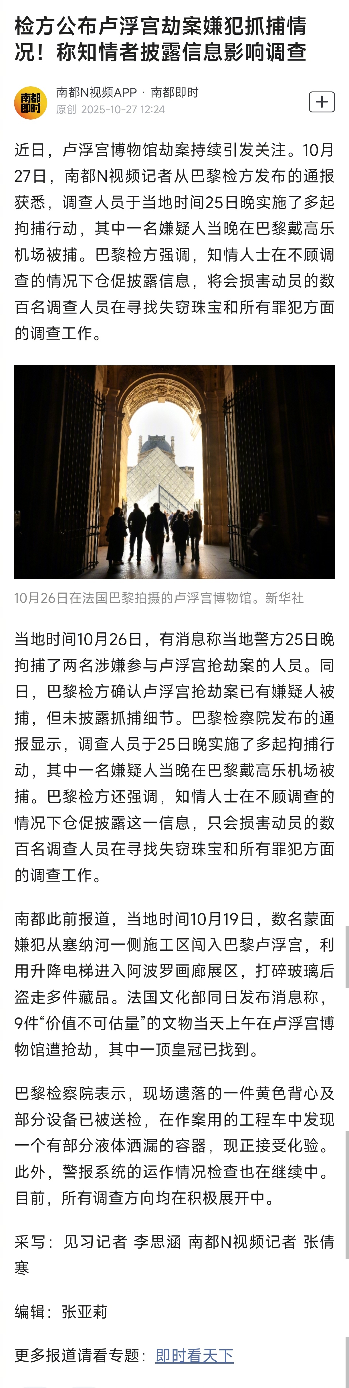 【#检方公布卢浮宫劫案嫌犯抓捕情况#!称知情者披露信息影响调查】近日,卢浮宫博物馆劫案持续引发关注。10月27日,N视频记者从巴黎检方发布的通报获悉,调查人员于当地时间25日晚实施了多起拘捕行动,其中一名嫌疑人当晚在巴黎戴高乐机场被捕。巴黎检方强调,知情人士在不顾调查的情况下仓促披露信息,将会损害动员的数百名调查人员在寻找失窃珠宝和所有罪犯方面的调查工作。