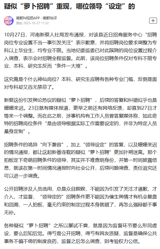 #萝卜招聘屡试不爽监督环节形同虚设#【南都快评:疑似“萝卜招聘”重现,哪位领导“设定”的】#萝卜招聘为何屡试不爽#公开招聘涉及人员选用,总是众目睽睽,不能因为引发了关注才道歉、才介入、才监督,“领导定的”招聘条件更不能因为催生舆情才有机会复盘和回溯,一人拍板、毫无约束的制定过程本身就错了,再怎么强辩都于事无补。