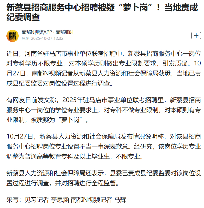 #被疑萝卜岗新蔡县责成纪委调查#【新蔡县招商服务中心招聘被疑“萝卜岗”!当地责成纪委调查】近日,河南省驻马店市事业单位联考招聘中,新蔡县招商服务中心一岗位对专科学历不限专业,对本硕学历则做出专业限制要求,引发质疑。10月27日,南都N视频记者从新蔡县人力资源和社会保障局获悉,当地已责成县纪委监委对岗位设置过程进行调查。